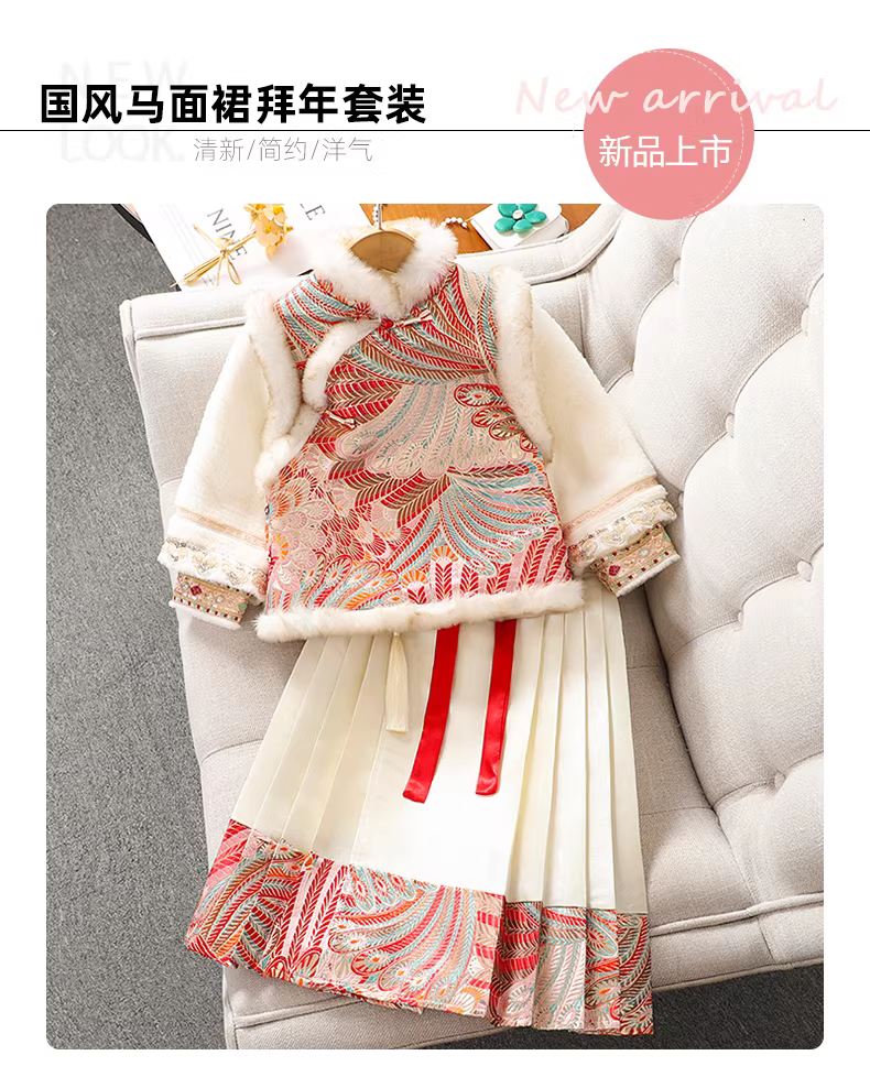- Váy Hanfu Tết Nguyên đán cho bé gái, trang phục mùa đông 2025, kiểu mới, phong cách Trung Hoa, chân váy mặt ngựa, bộ hai mảnh, bộ đồ thu đông cho trẻ em
