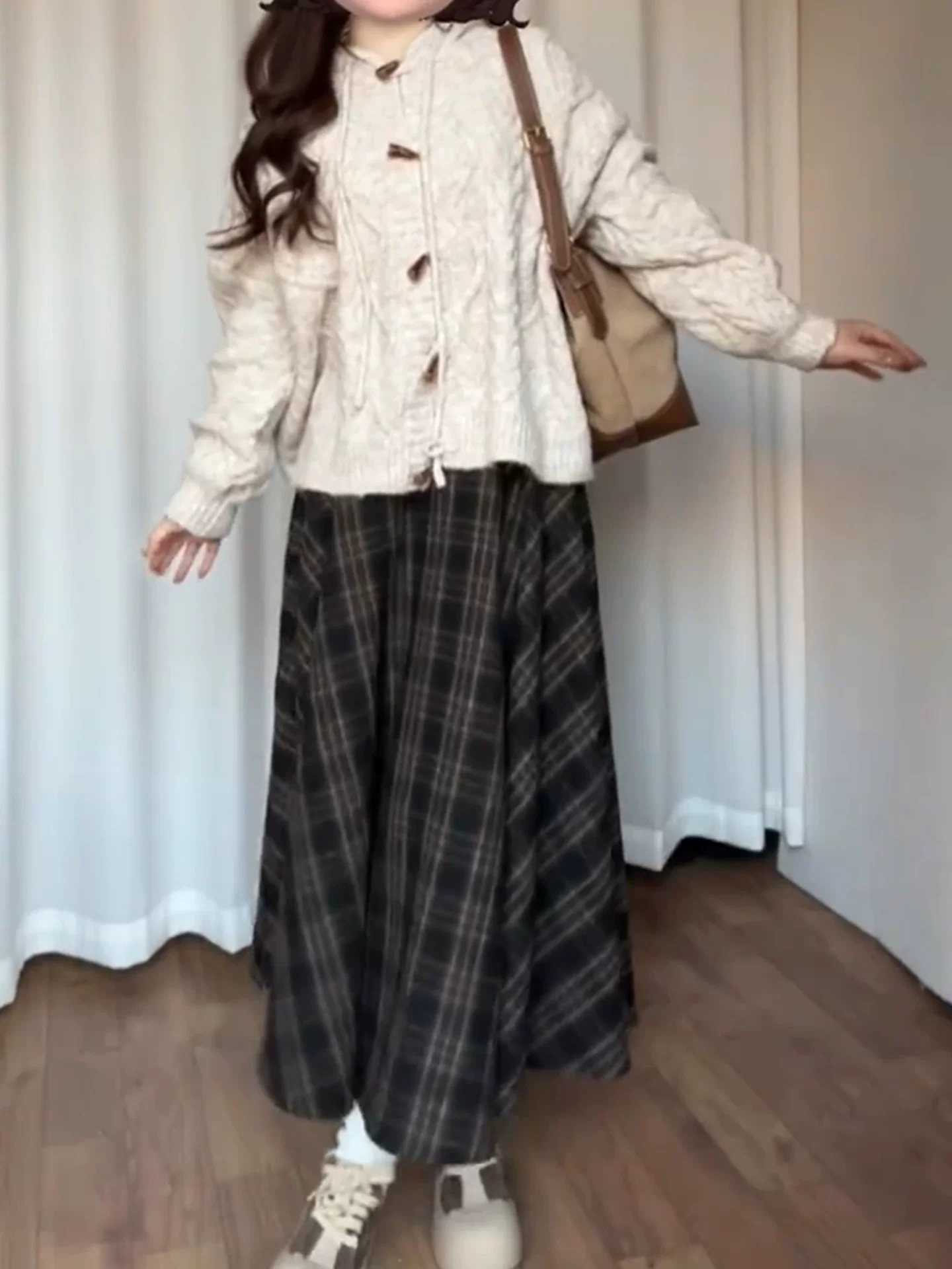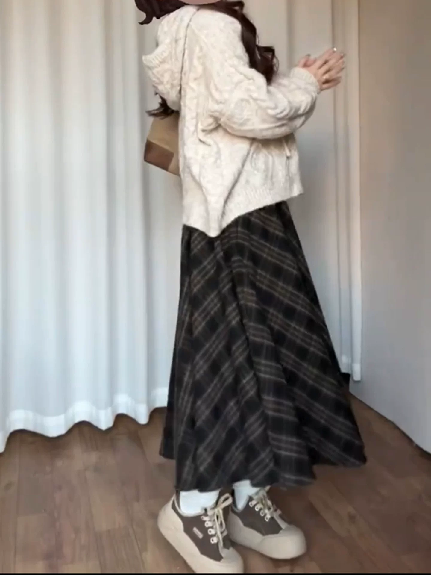 - Váy kẻ sọc màu cà phê cổ điển Melard dành cho nữ, cỡ lớn mùa thu, lưng cao, thon gọn, váy chữ A cỡ lớn.