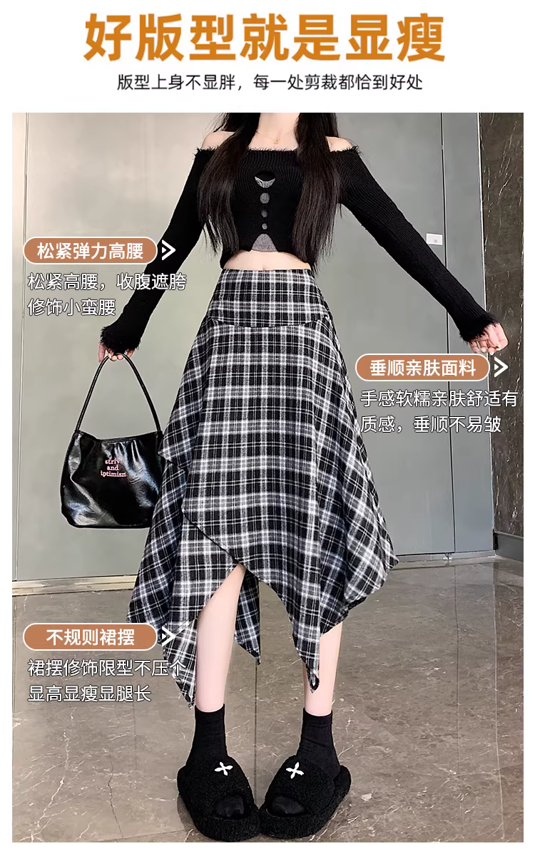 Váy kẻ sọc nữ xuân thu đông, váy kẻ sọc nâu, váy dù bất đối xứng, váy nửa thân rất đẹp, váy nửa thân