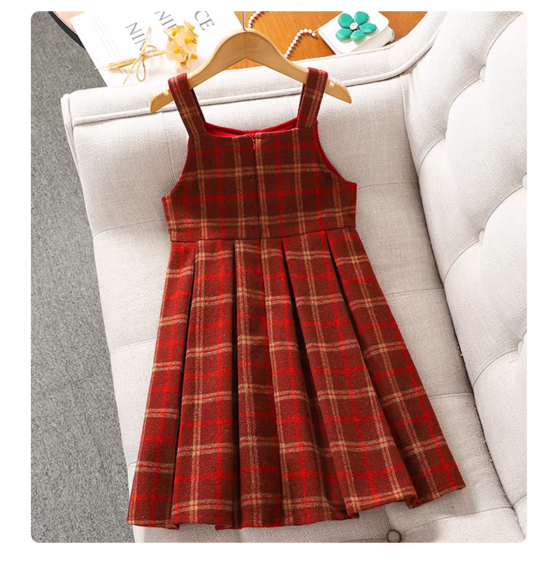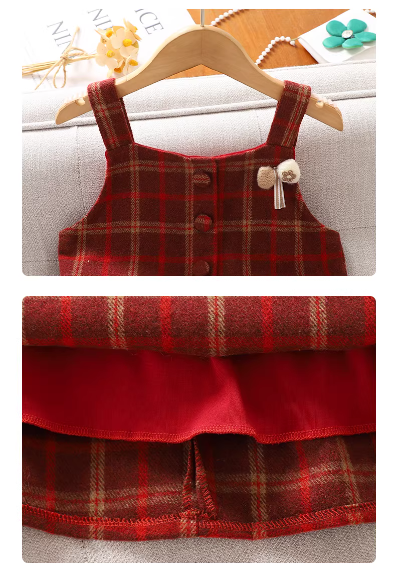 - Váy kiểu Chanel nhỏ nhắn dành cho bé gái, trang phục chào mừng năm mới cho trẻ em mùa thu đông, váy kẻ sọc, váy bộ đồ năm mới màu đỏ cho bé gái.