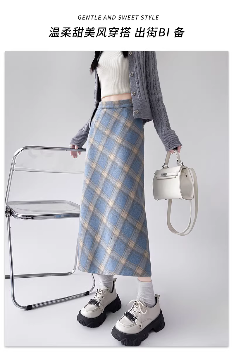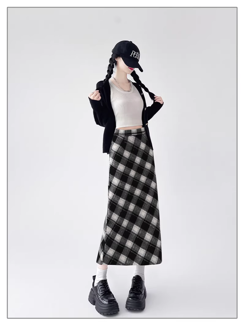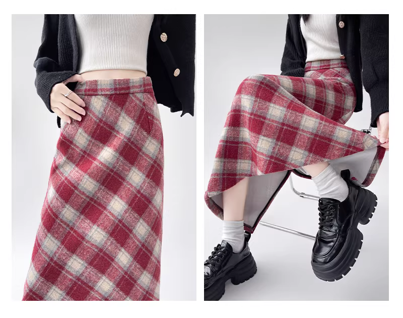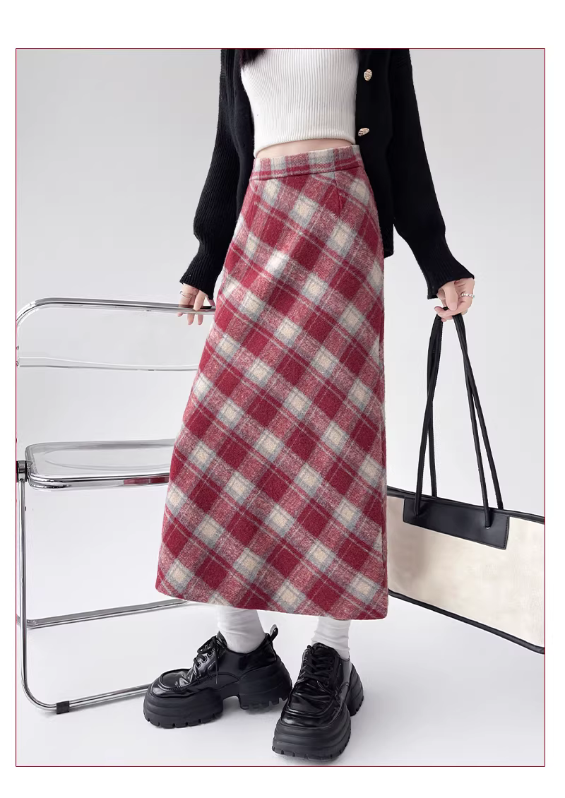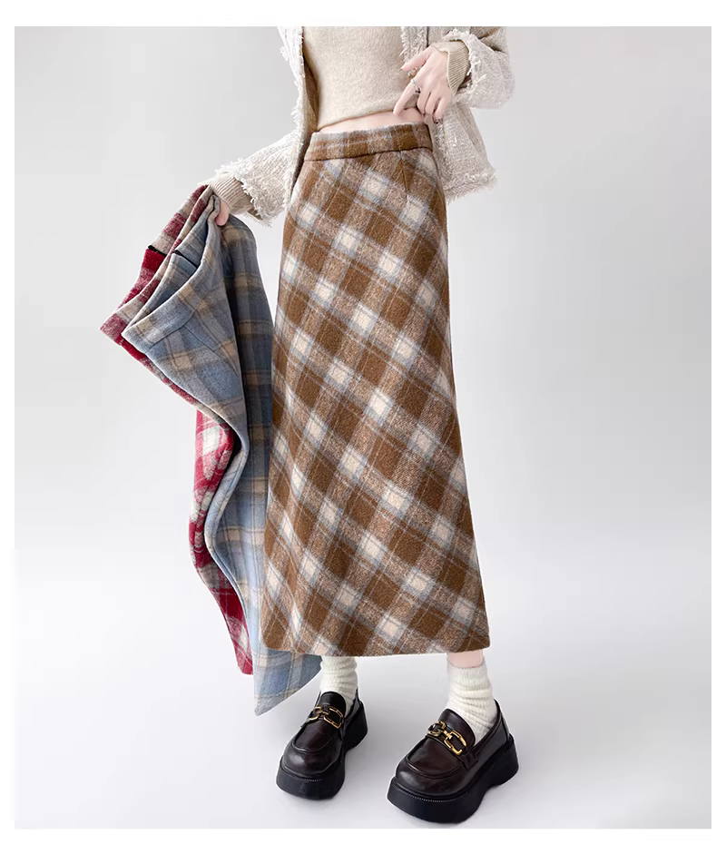 - Váy len kẻ ca rô La Chapelle dành cho nữ, mẫu mới thu đông 2025, cạp cao, dáng chữ A, dài qua gối.