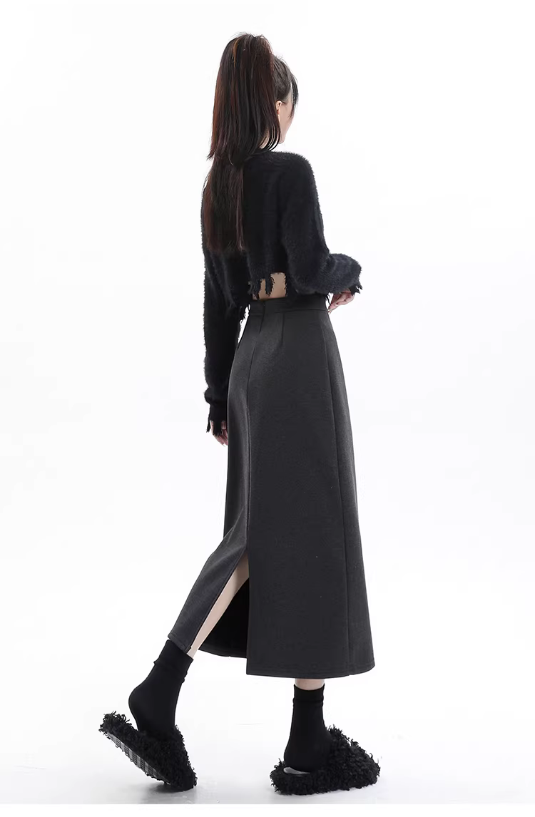 Váy len lót lông cừu đen La Chapelle dành cho nữ, váy dài ngang đùi xẻ tà cao cấp mùa thu đông 2025