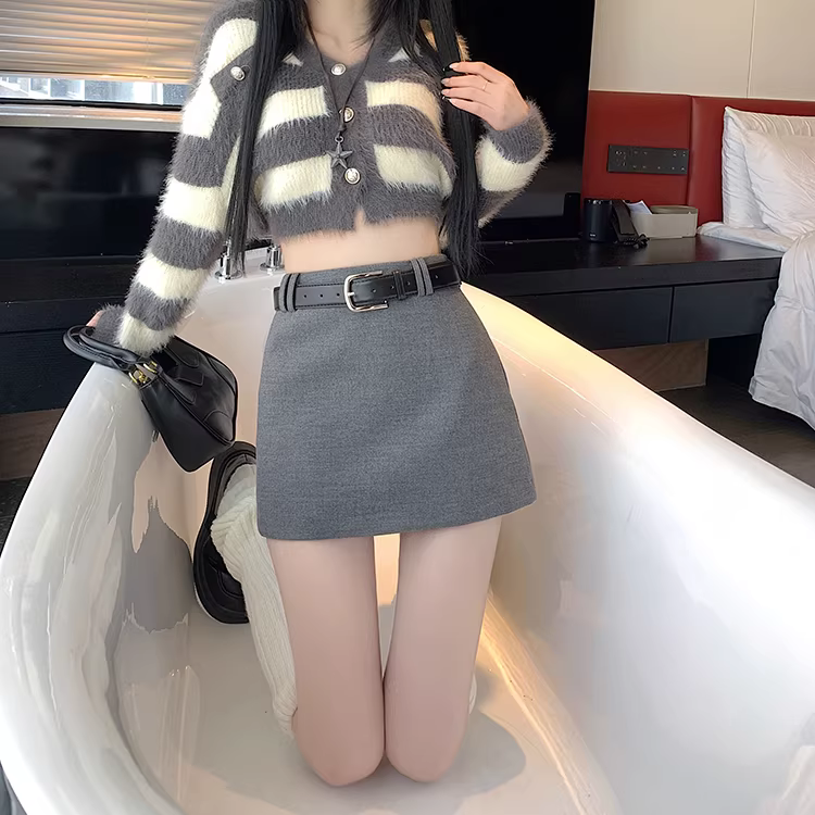 Váy len màu xám cho nữ, váy bút chì mùa thu đông, váy len chữ A lưng cao, váy mini hot girl.