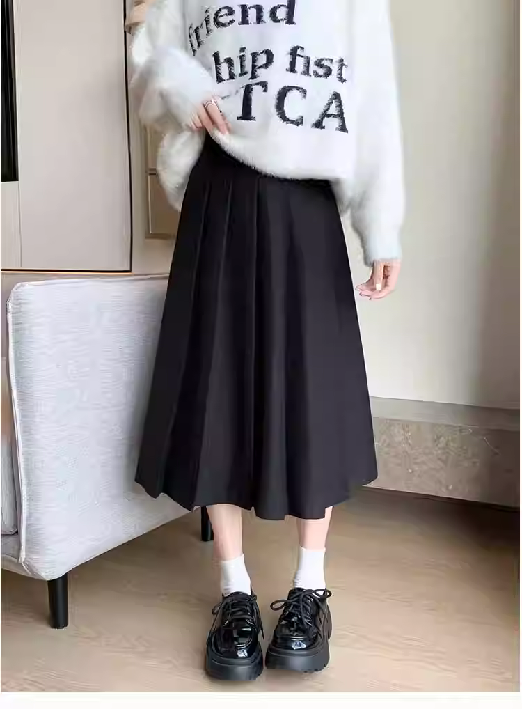 Váy len màu xám cho nữ, váy len xếp ly dài vừa phải mùa đông, váy chữ A, váy dù, phối cùng áo len, váy dài