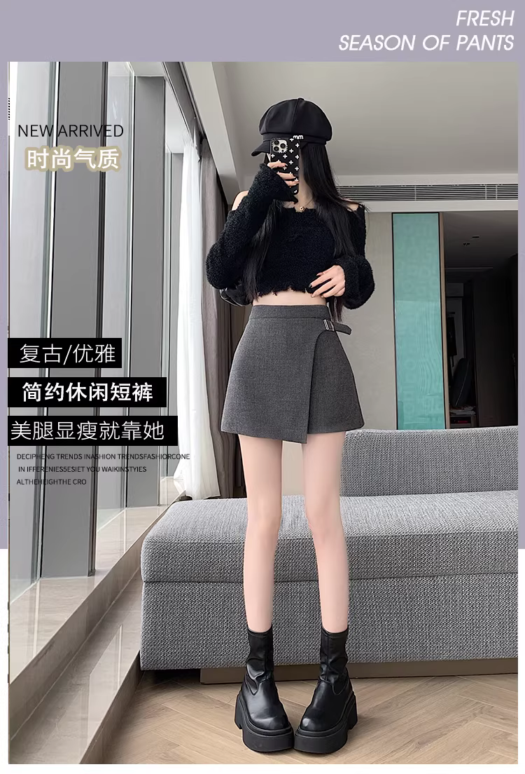 Váy len màu xám dành cho nữ, mùa thu đông, váy quần dáng bất quy tắc, váy len giả hai mảnh liền thân, váy chữ A, váy ngắn.