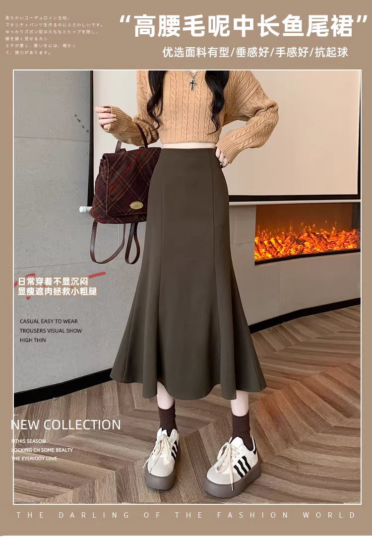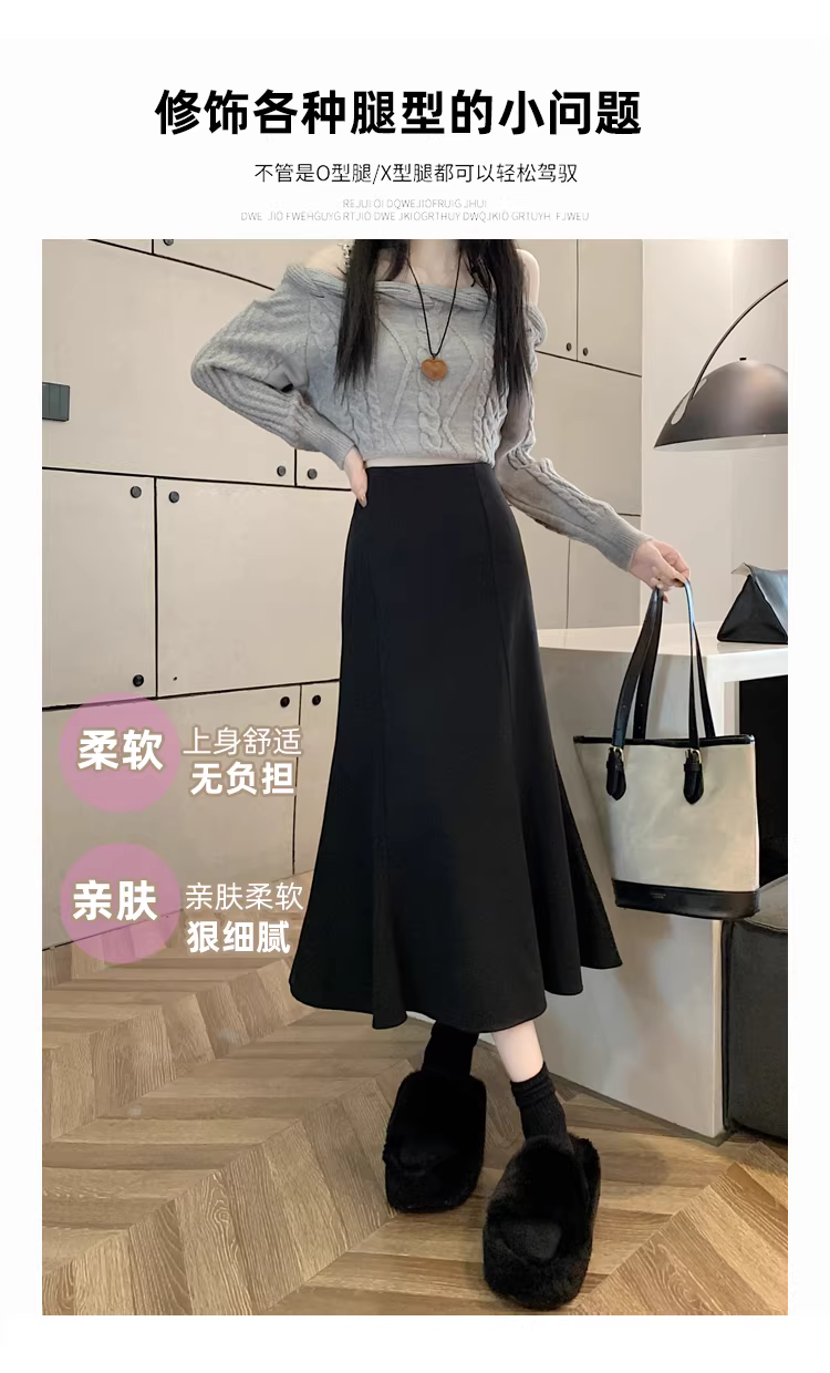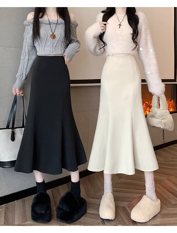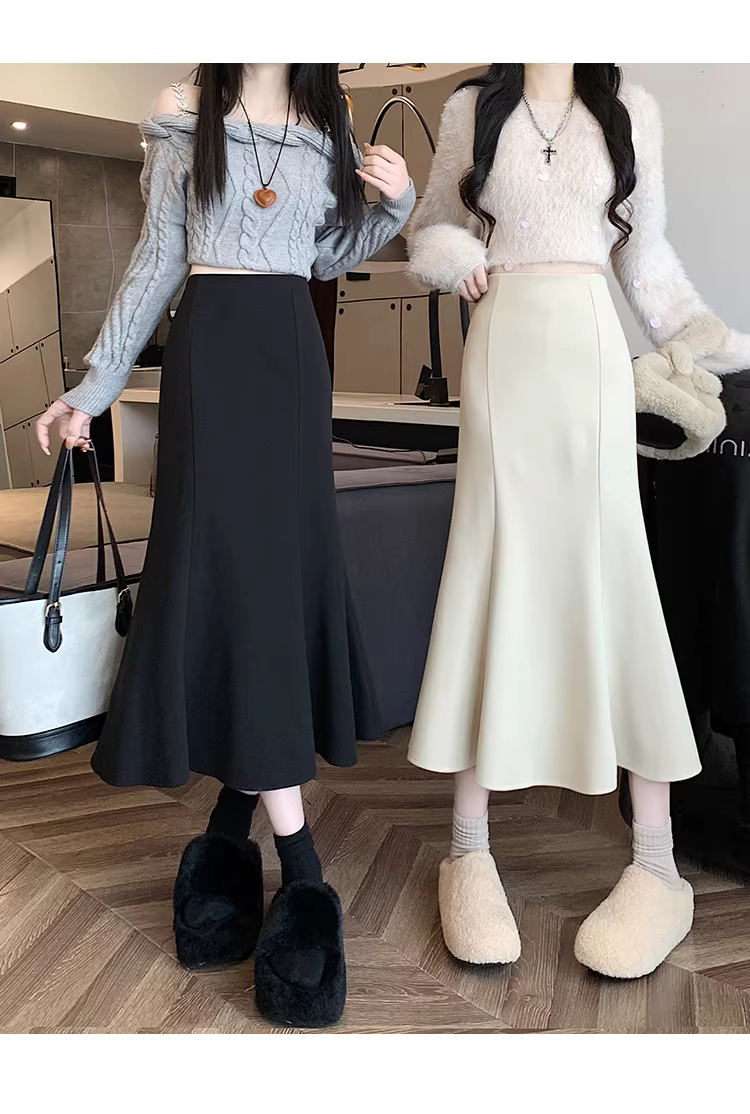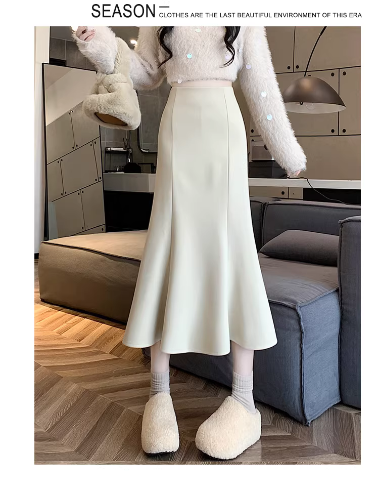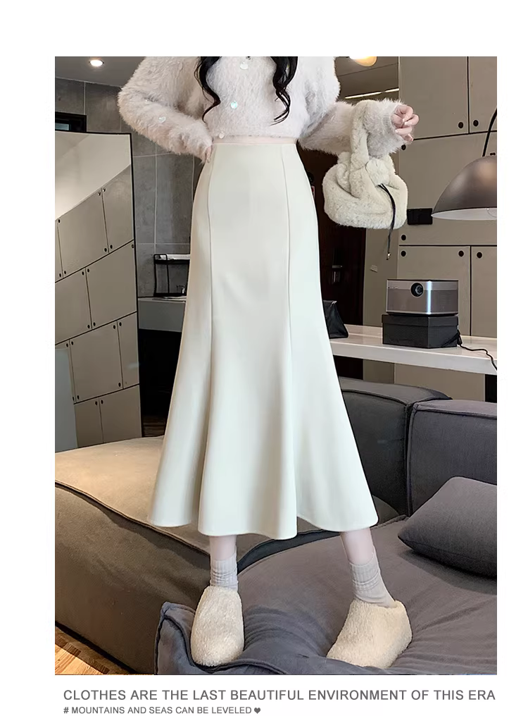 - Váy len trắng La Chapelle dành cho nữ, mùa thu đông 2025, kiểu dáng mới, cạp cao, dáng chữ A, đuôi cá, ôm sát, dài ngang đùi