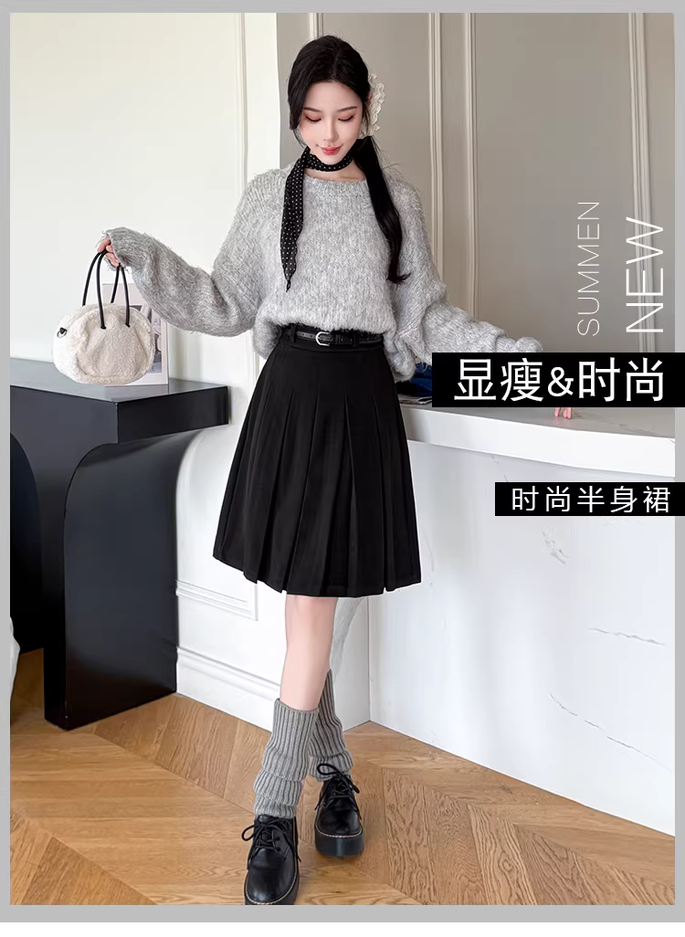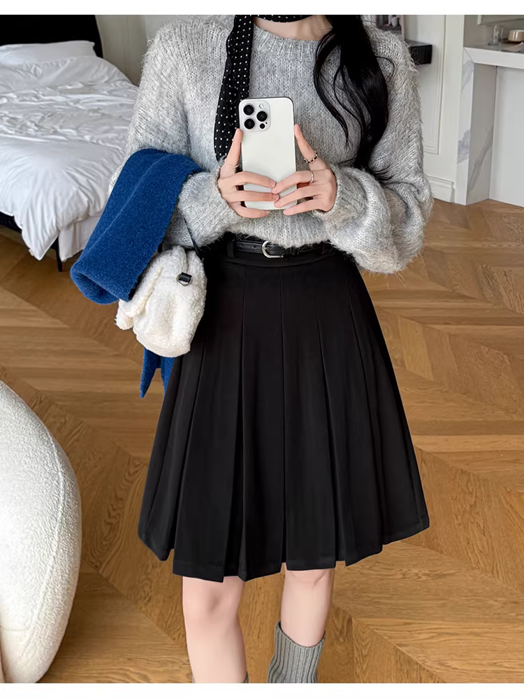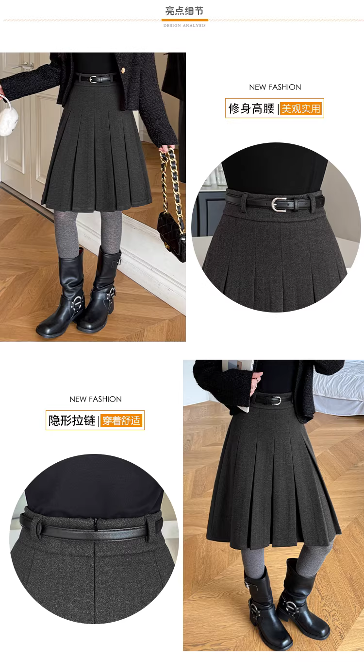 Váy len xếp ly 5 điểm màu đen, váy chữ A dài trung bình mùa thu đông dành cho nữ, phối cùng áo len, váy len dài trung bình.