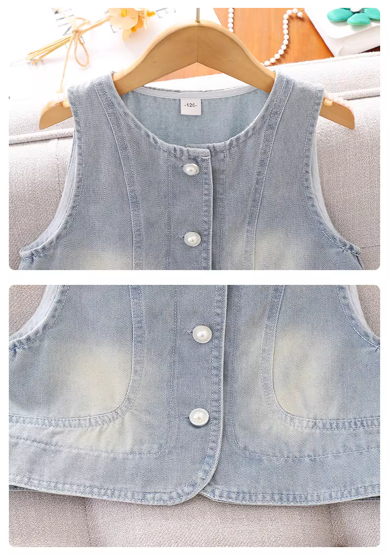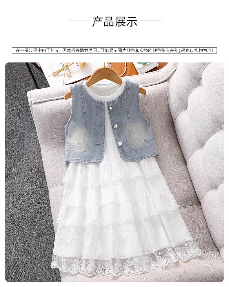 - Váy liền thân bé gái hè 2025 kiểu mới, áo vest denim bé gái, váy bánh bèo, trang phục hè, váy trắng trẻ em