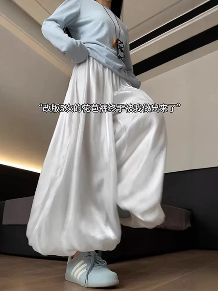 Váy lửng satin trắng cho nữ, size lớn mùa hè, cạp cao, dáng rộng, tôn dáng, dành cho người có thân hình quả lê, quần kiểu đèn lồng, mặc thường ngày