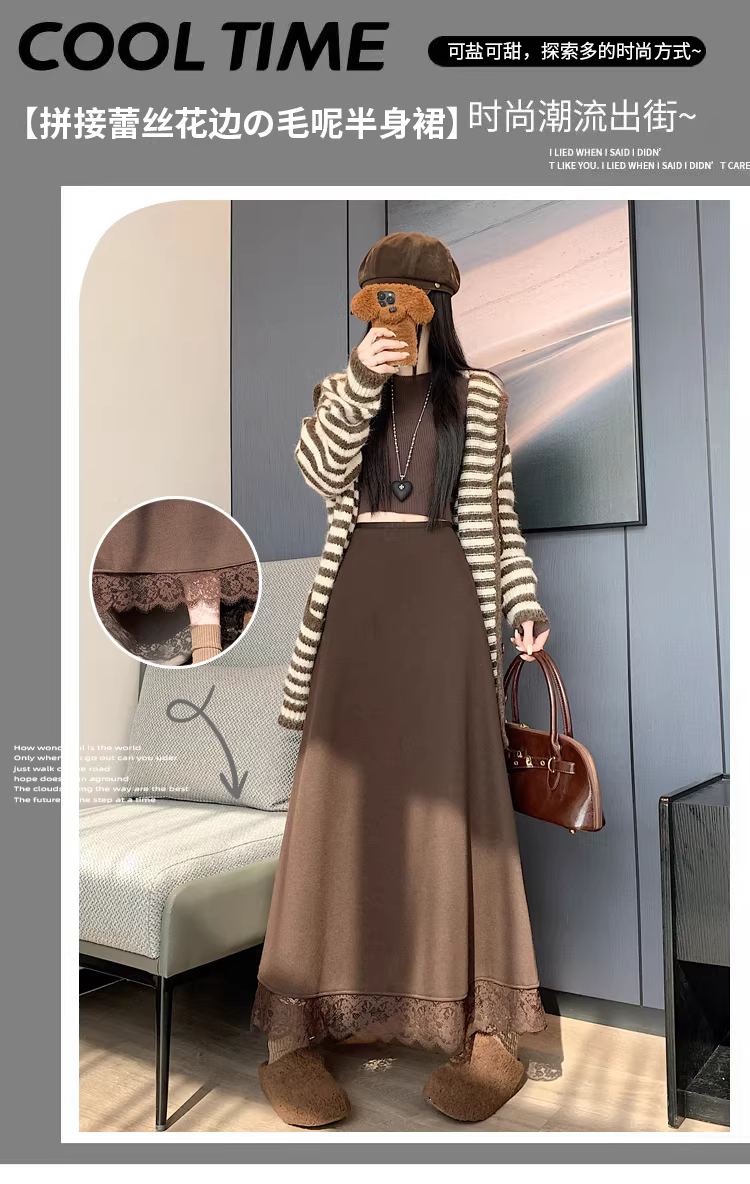 Váy midi len màu nâu dành cho nữ, mùa thu đông, váy dù dài vừa phải, váy len lót lông cừu và dày dặn, váy dài.