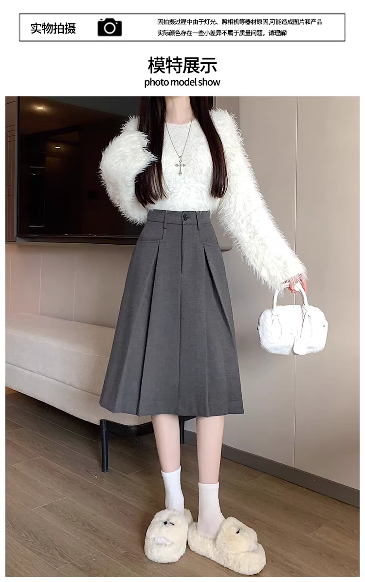 Váy midi len màu xám cho nữ, váy xếp ly mùa đông, váy len lưng cao, váy dài.