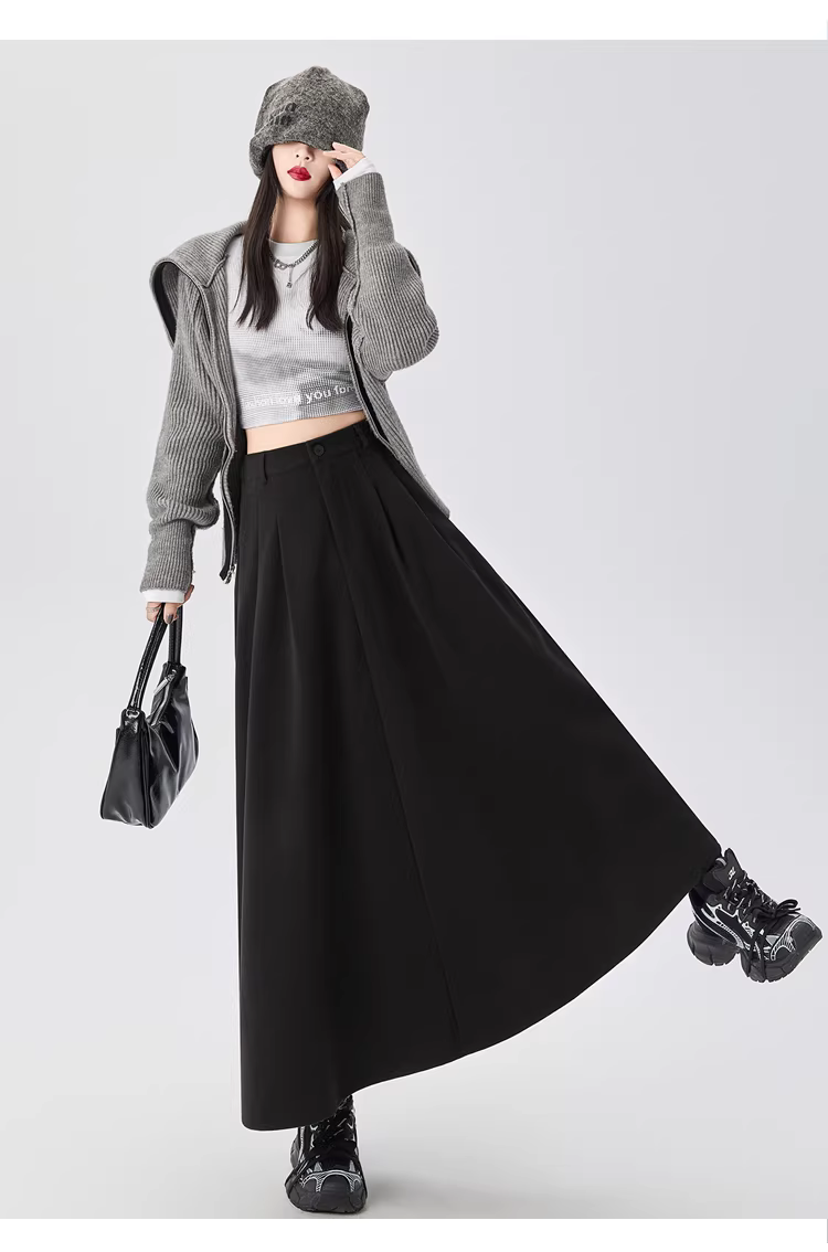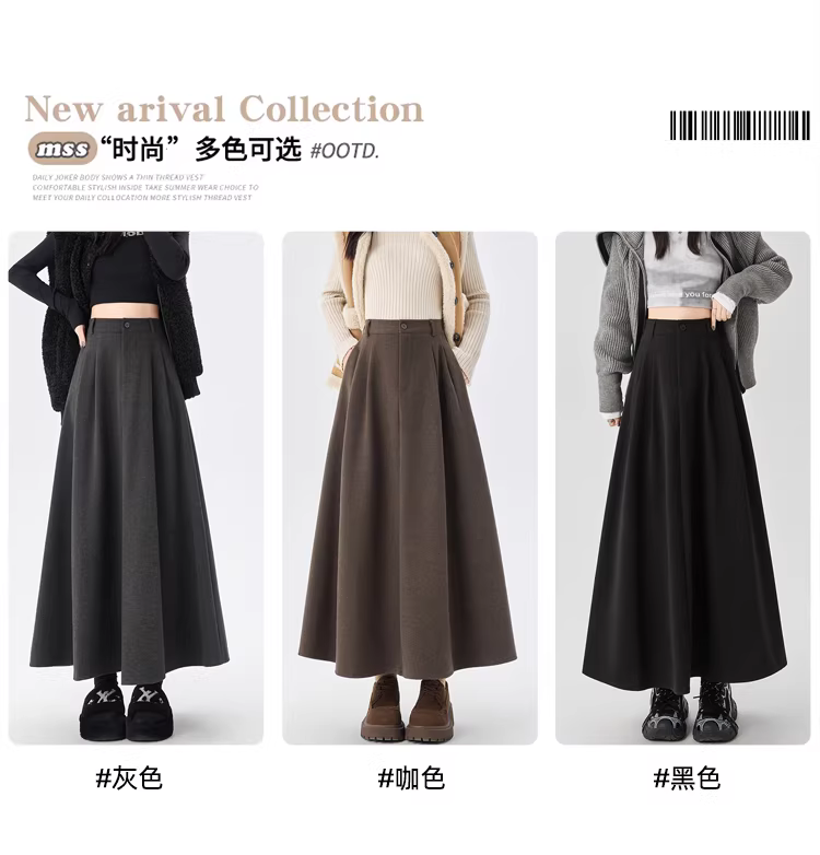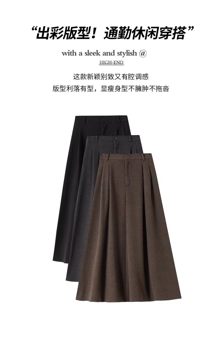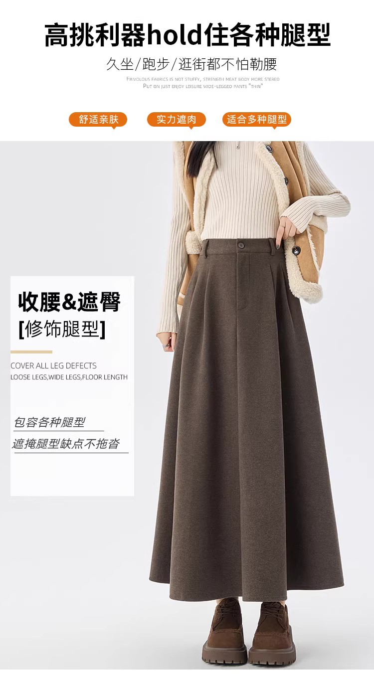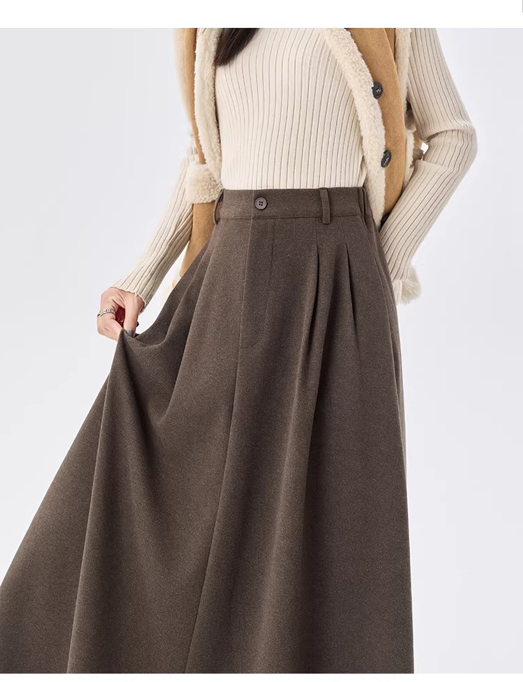 Váy midi len nâu La Chapelle dành cho phụ nữ nhỏ nhắn, váy cao eo che hông mới mùa thu đông 2025.