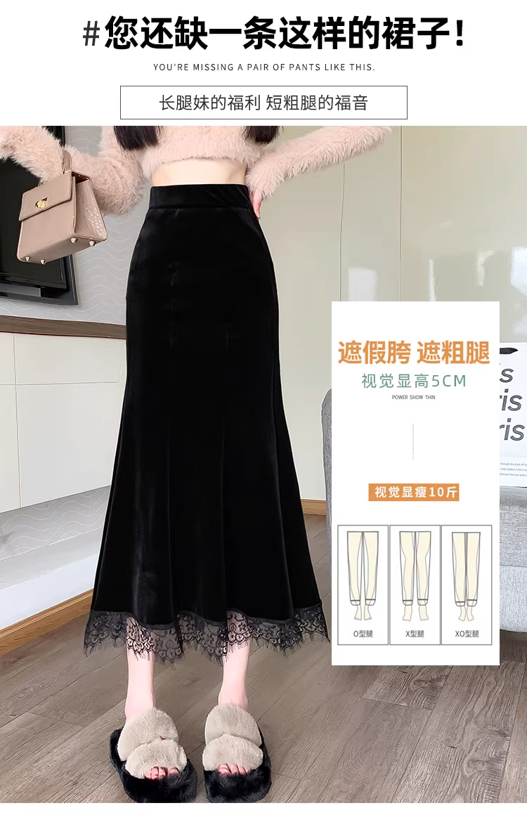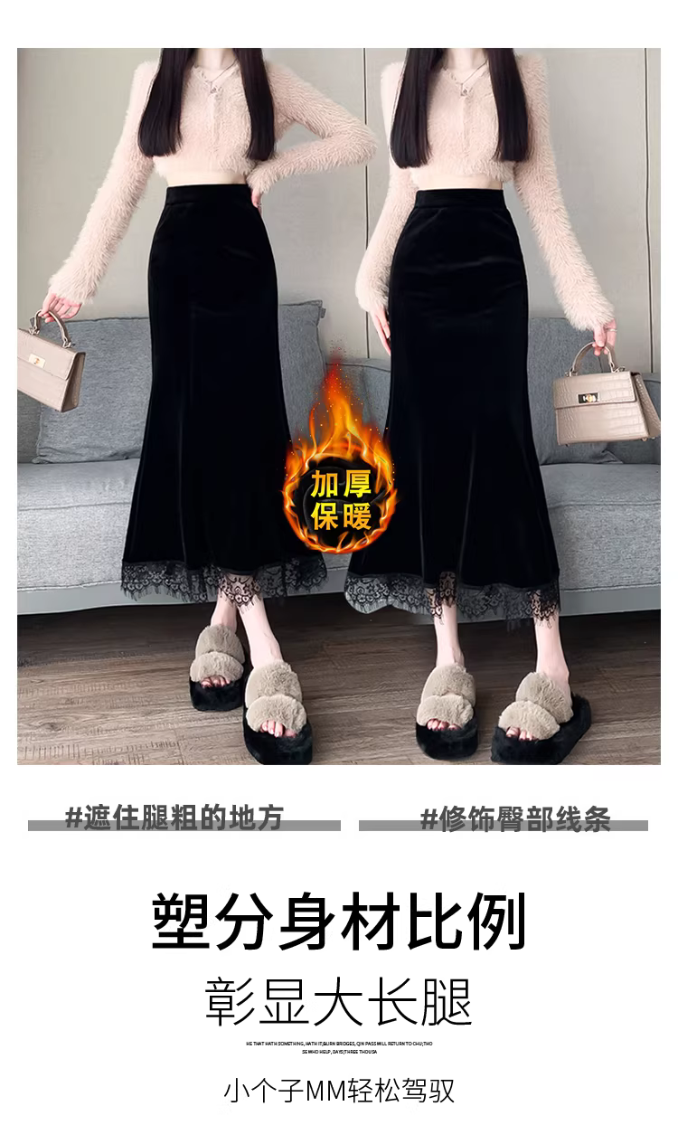 - Váy midi nhung nữ, thu đông, váy đuôi cá ôm sát, váy nhung viền ren, váy nửa thân.