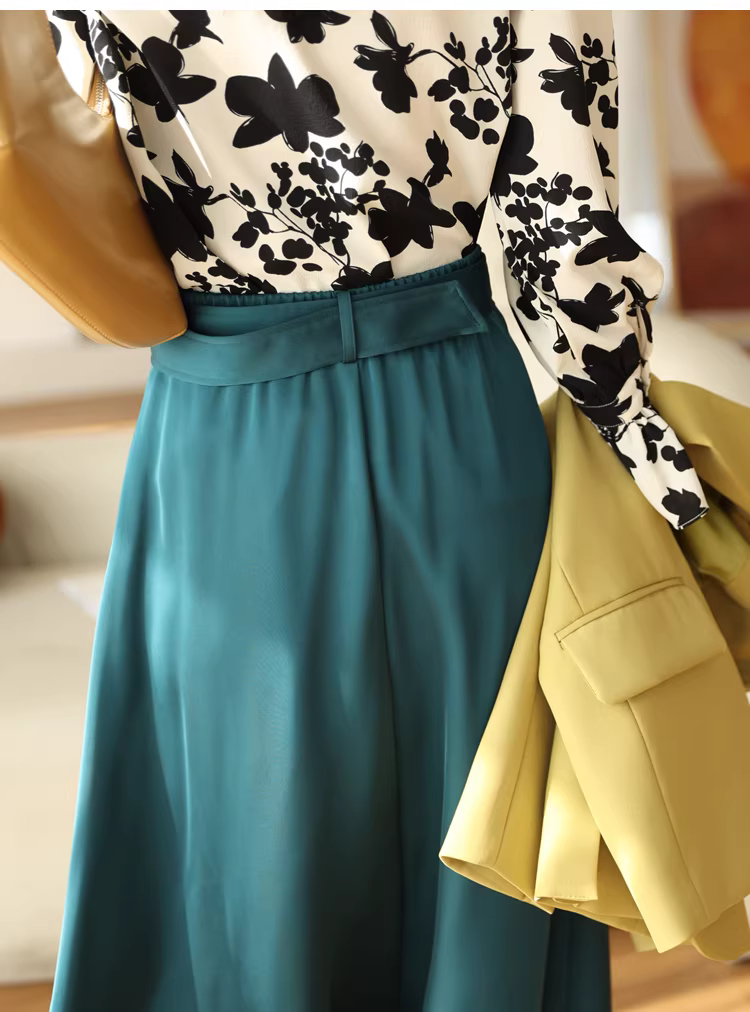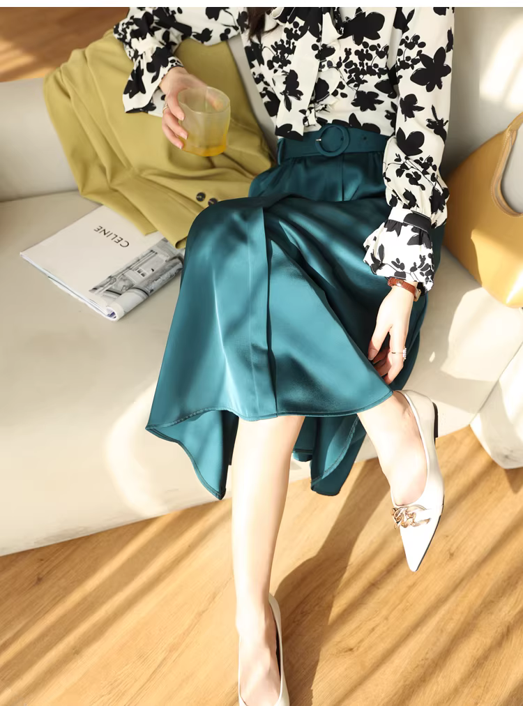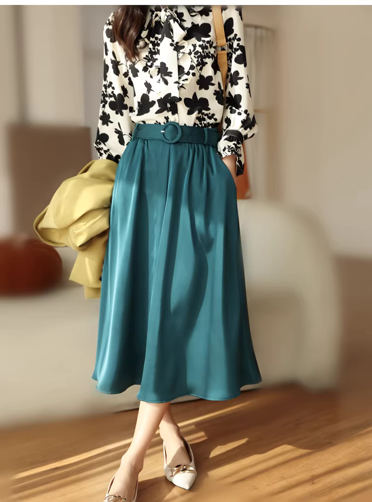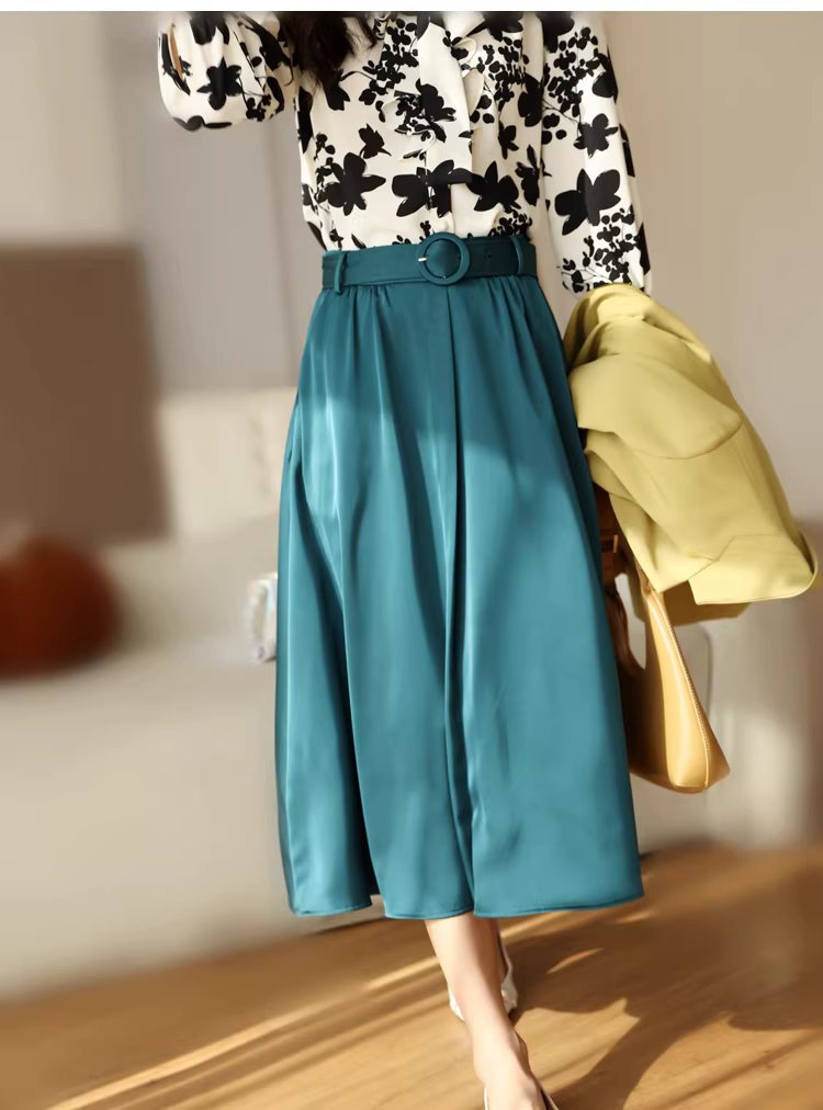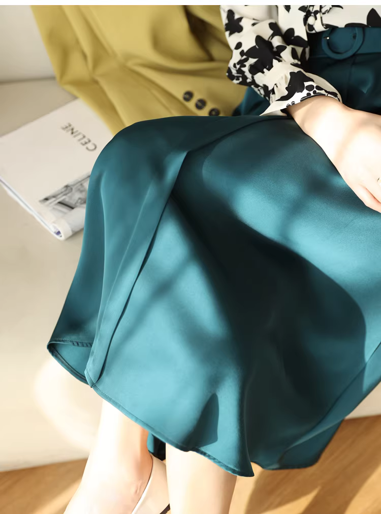Váy midi satin màu xanh chim công cao cấp, tôn dáng, dành cho nữ mùa xuân
