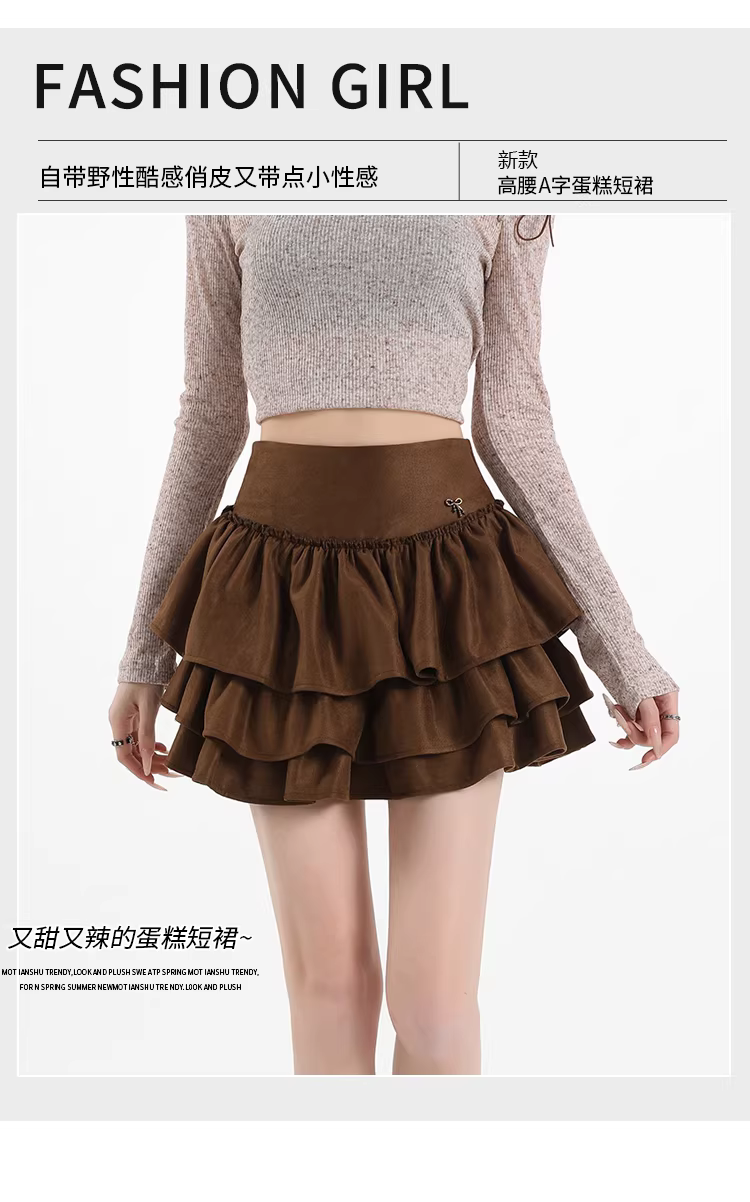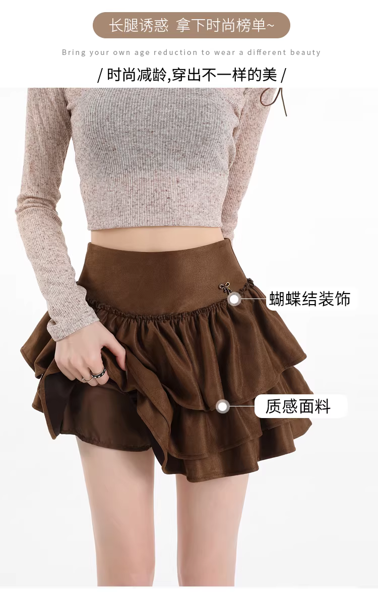 Váy ngắn da lộn nâu La Chapelle dành cho nữ, mẫu mới thu đông 2025, cạp cao, dáng chữ A, xòe bồng bềnh