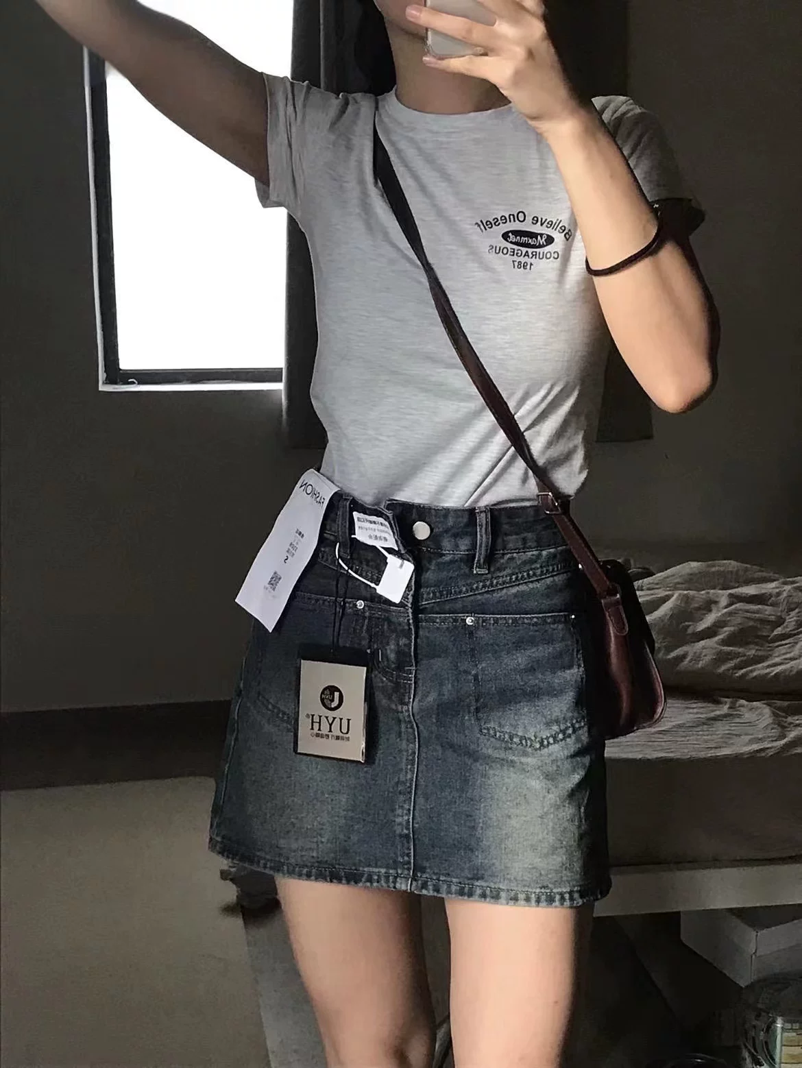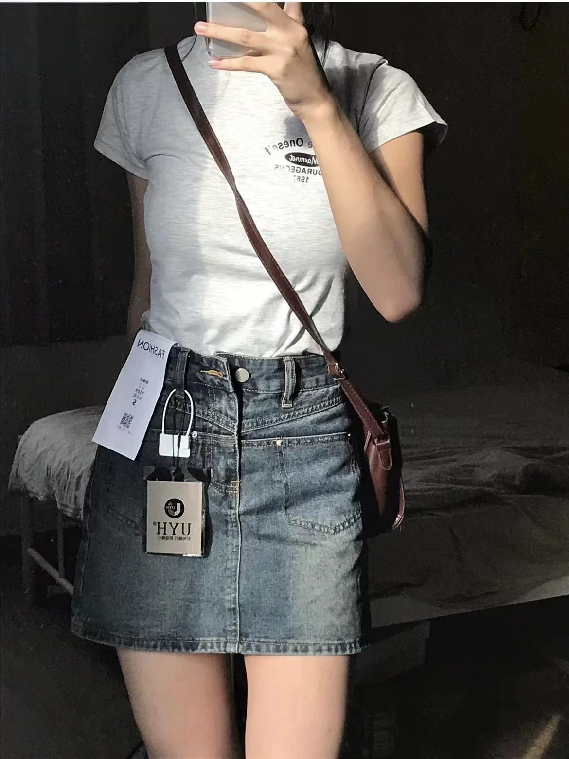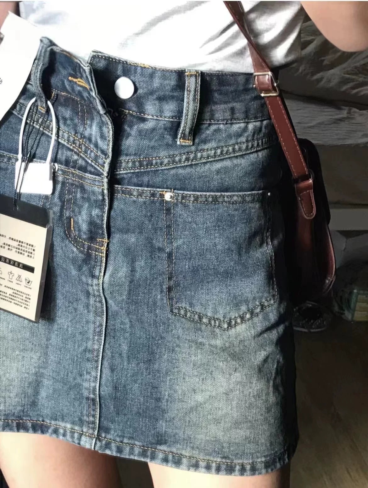 - Váy ngắn denim màu xanh cổ điển hình quả lê dành cho nữ, kiểu dáng mỏng mùa hè, cỡ lớn, eo cao, che hông, váy chữ A thon gọn.