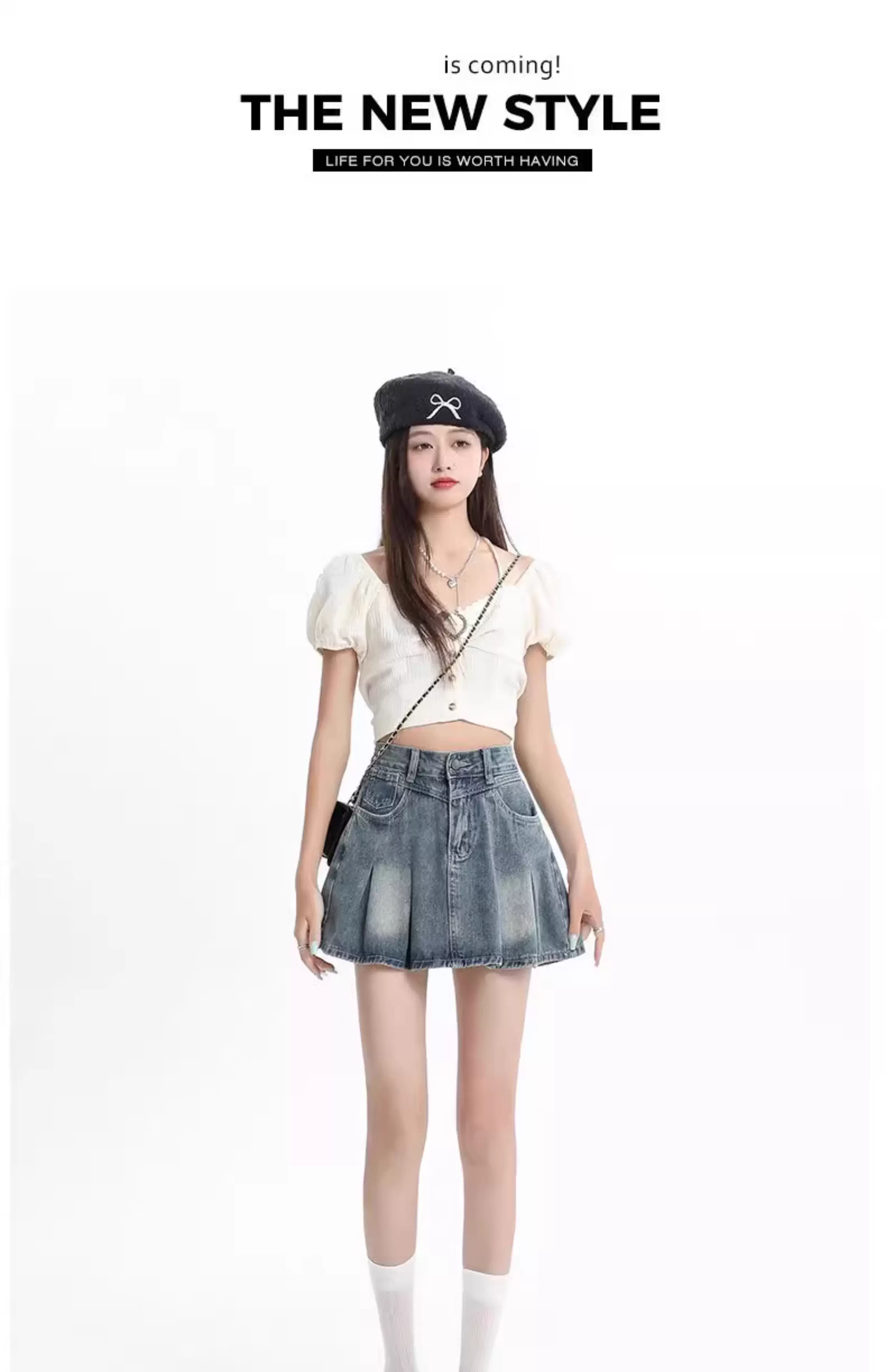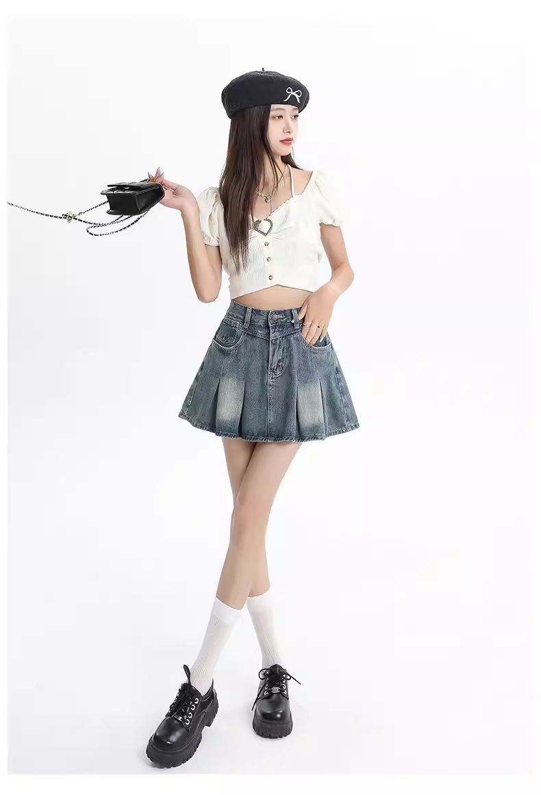 - Váy ngắn xếp ly denim cao eo màu sáng La Chapelle dành cho nữ, mẫu mới hè 2025, kiểu dáng chữ A chống lộ