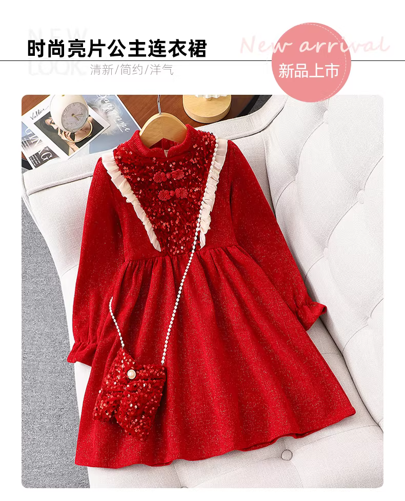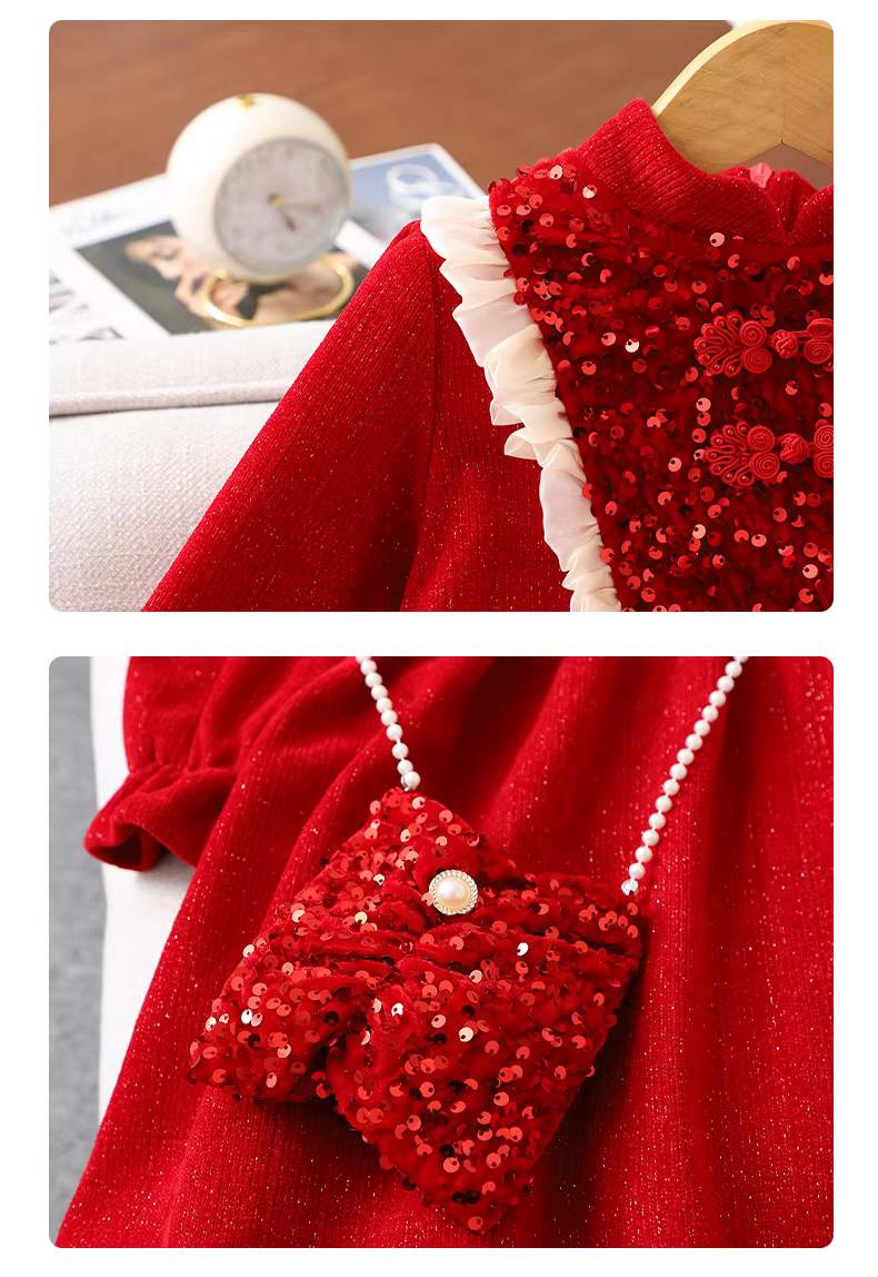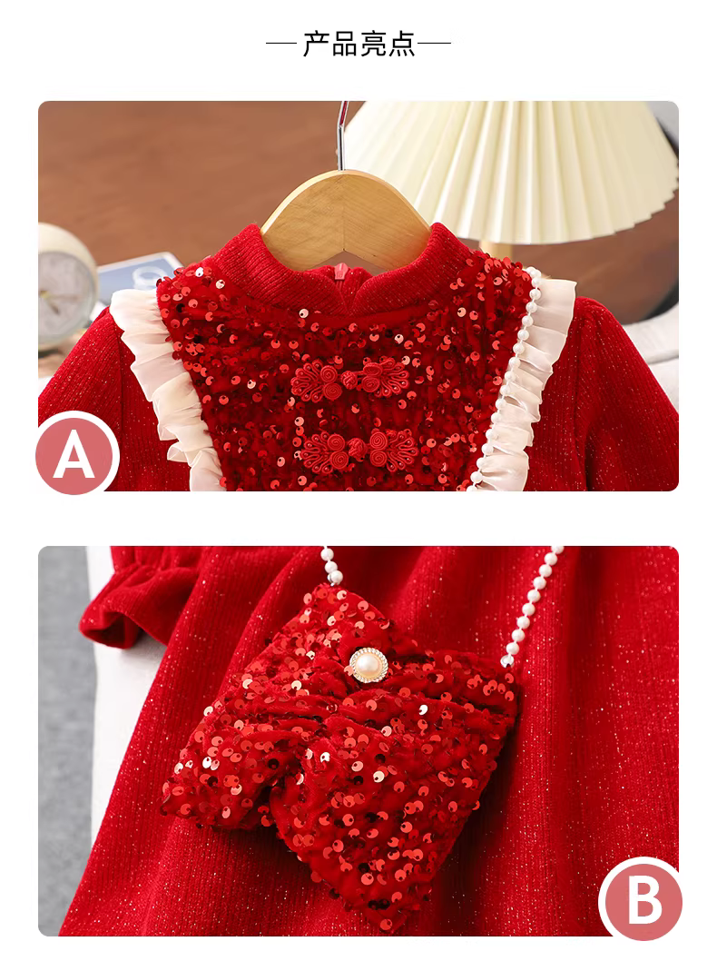 - Váy nhung bé gái có lớp lót lông cừu, váy công chúa màu đỏ thời trang thu đông cho trẻ em, trang phục Tết năm 2025.