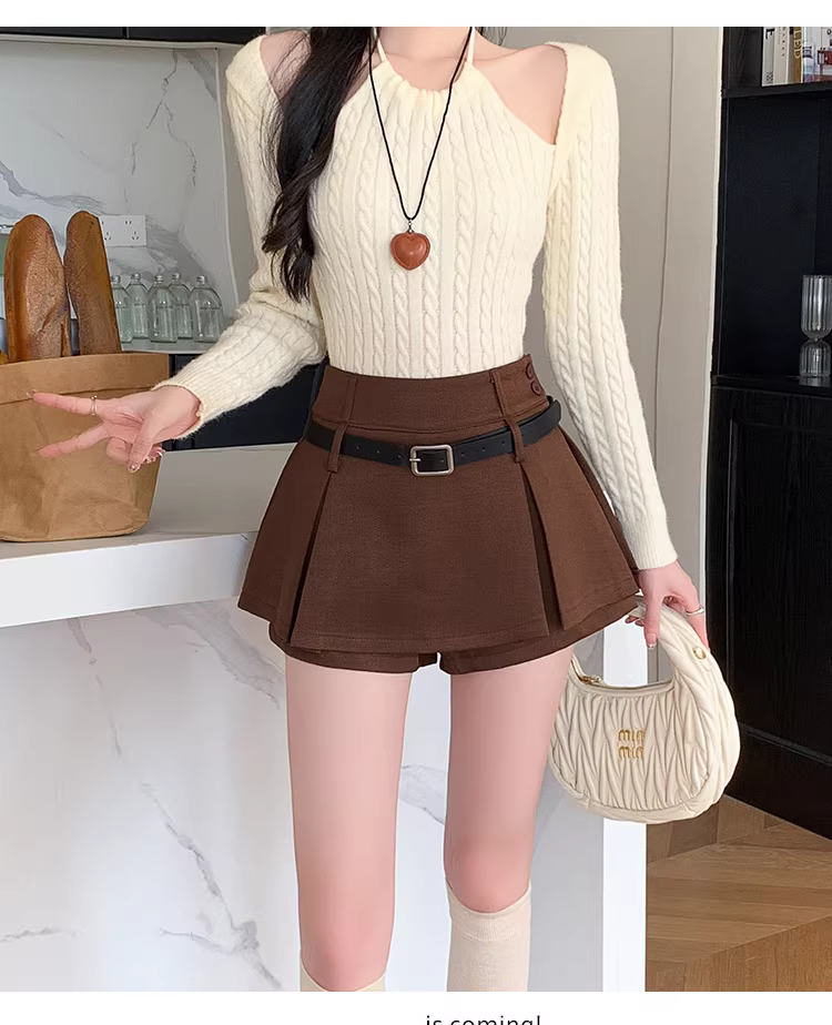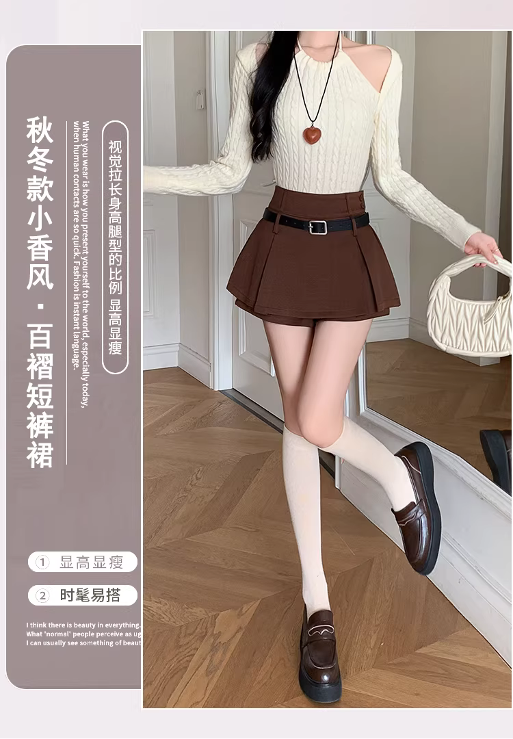 Váy nửa thân màu nâu dành cho nữ, thích hợp cho mùa xuân, mùa thu và mùa đông, váy quần xếp lớp, giả hai mảnh, váy quần xẻ tà, váy chữ A ngắn, váy ngắn.