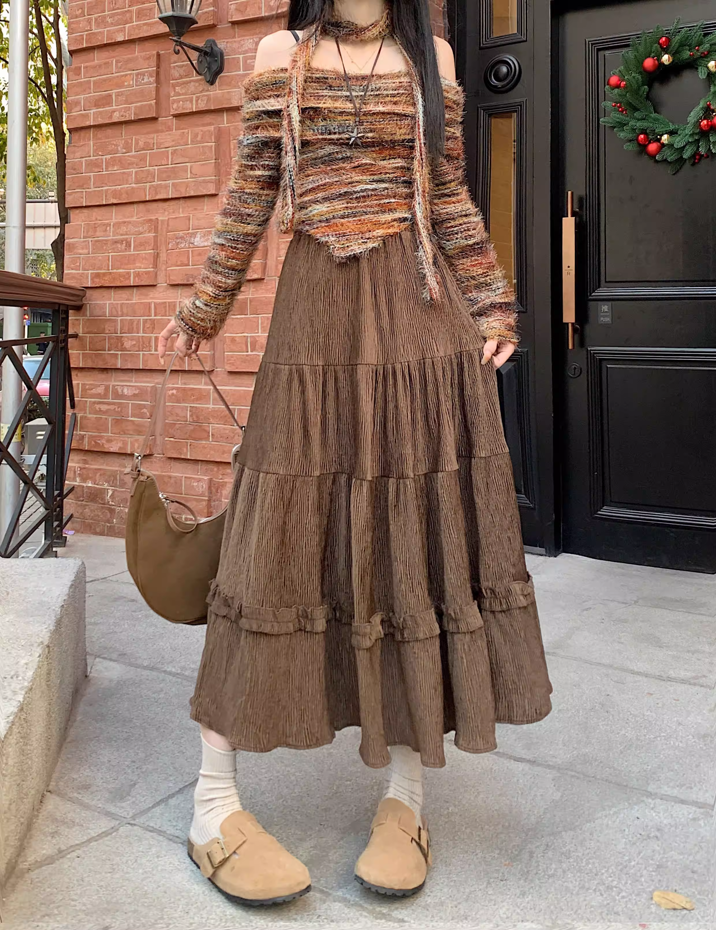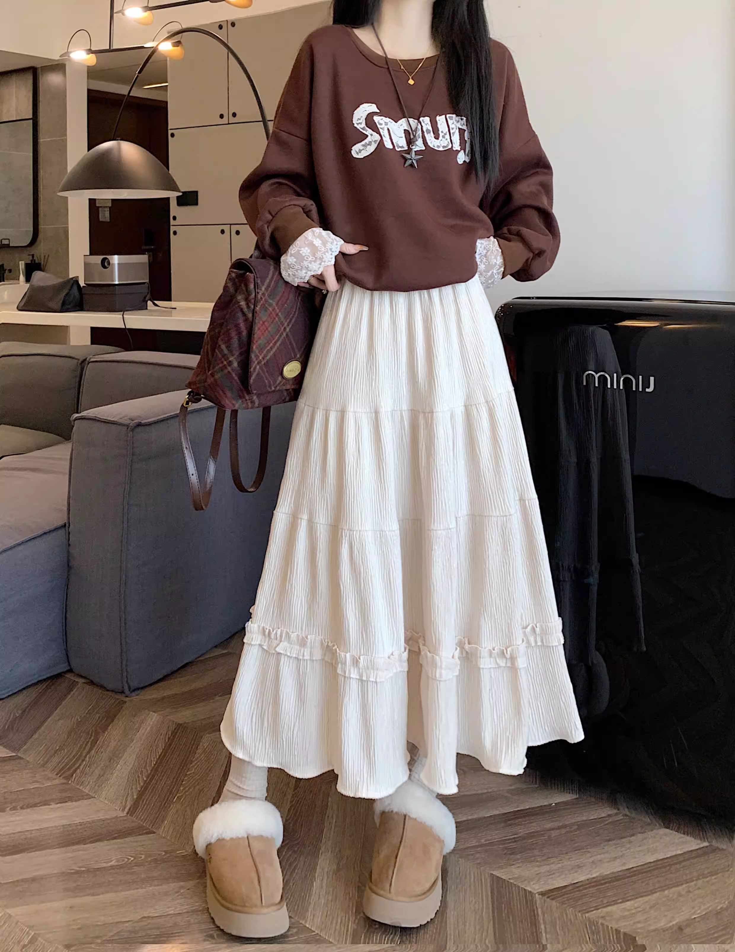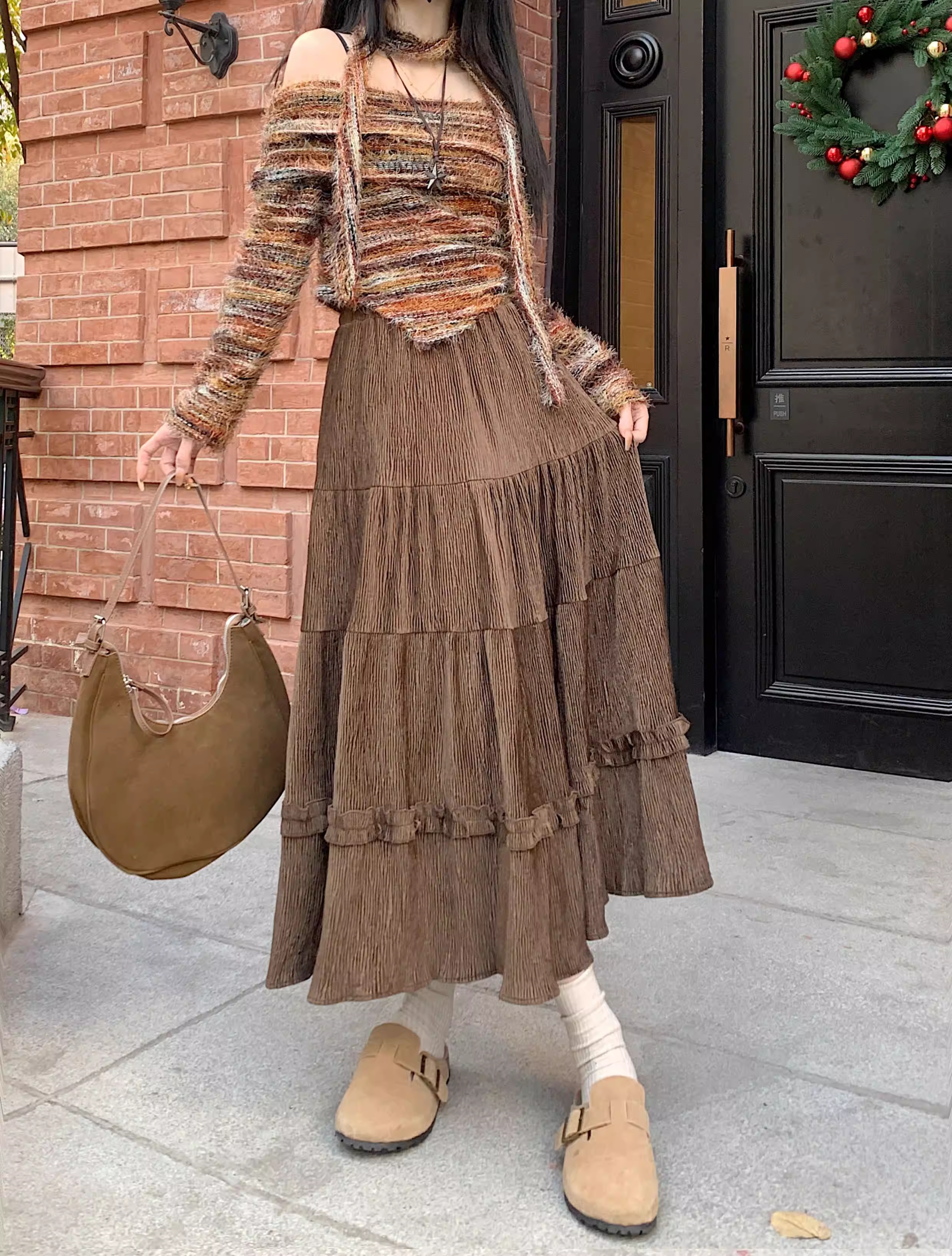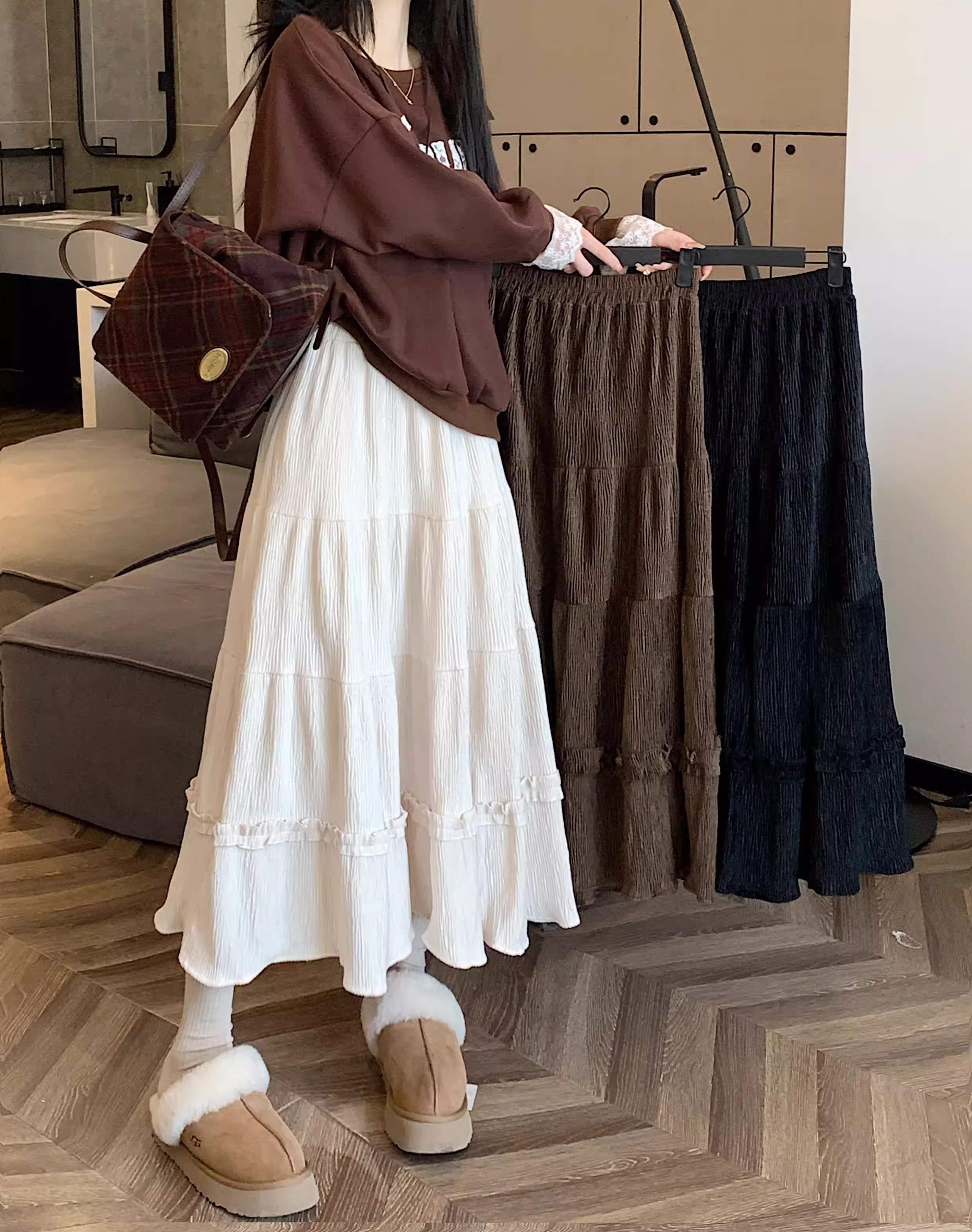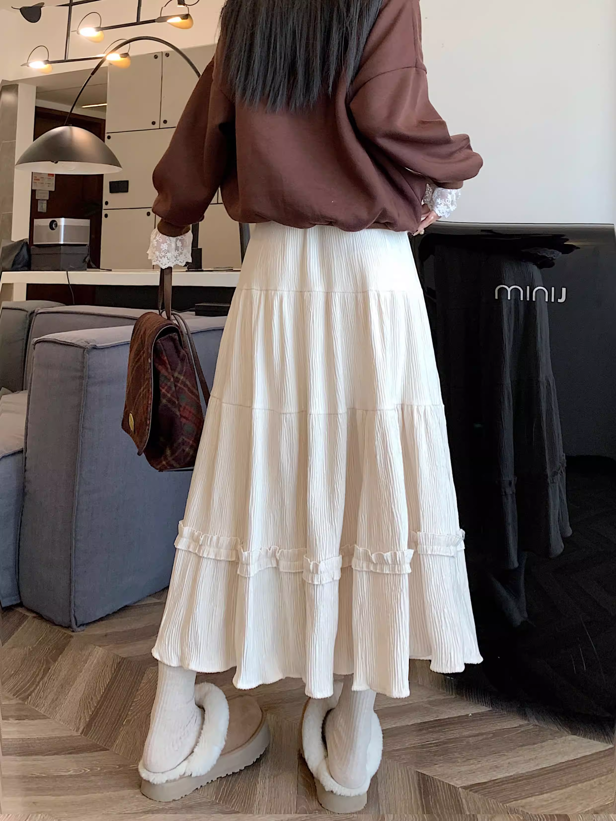 - Váy ren nhung La Chapelle dành cho nữ, mẫu mới thu đông 2025, cạp cao, dáng ôm, dài ngang đùi, xếp tầng