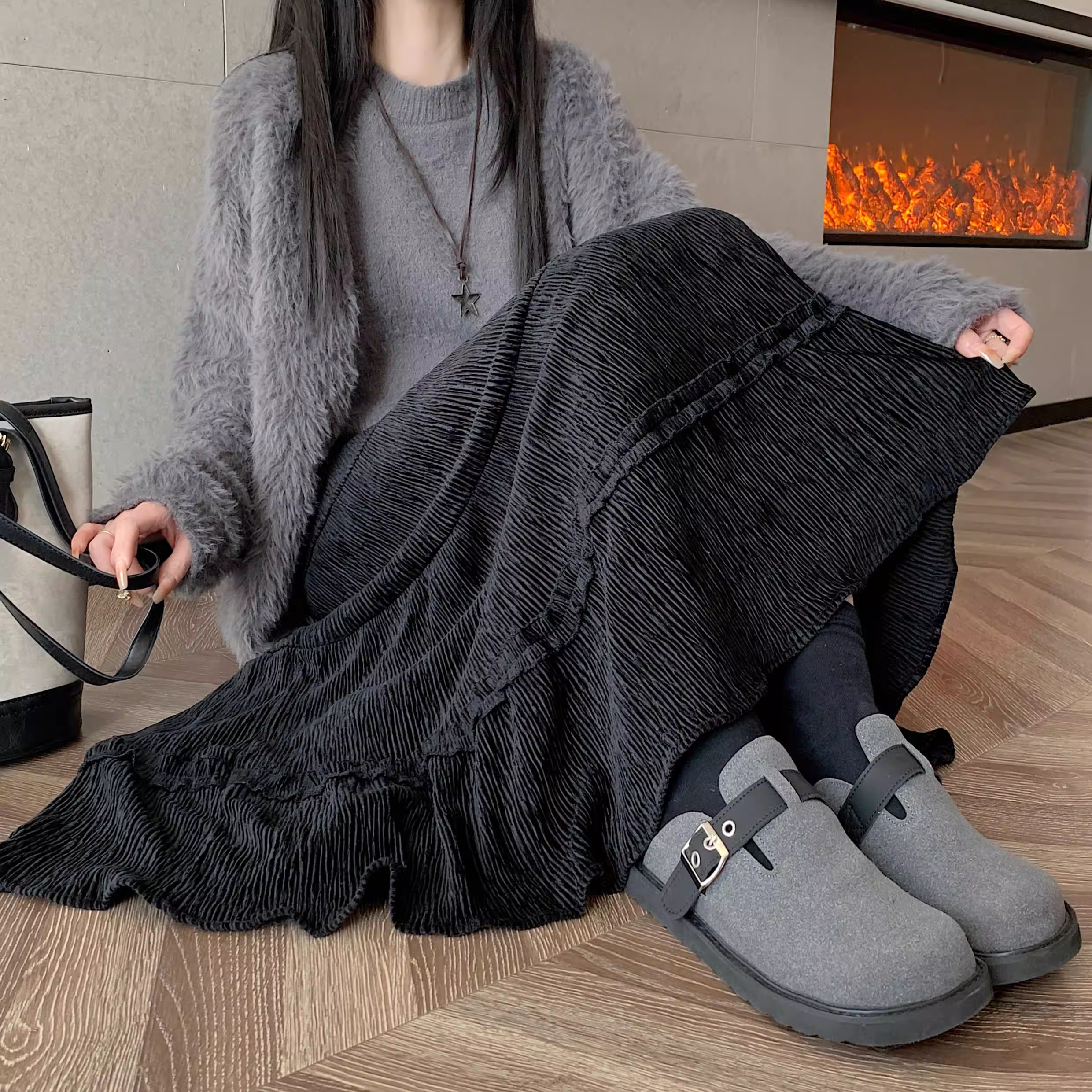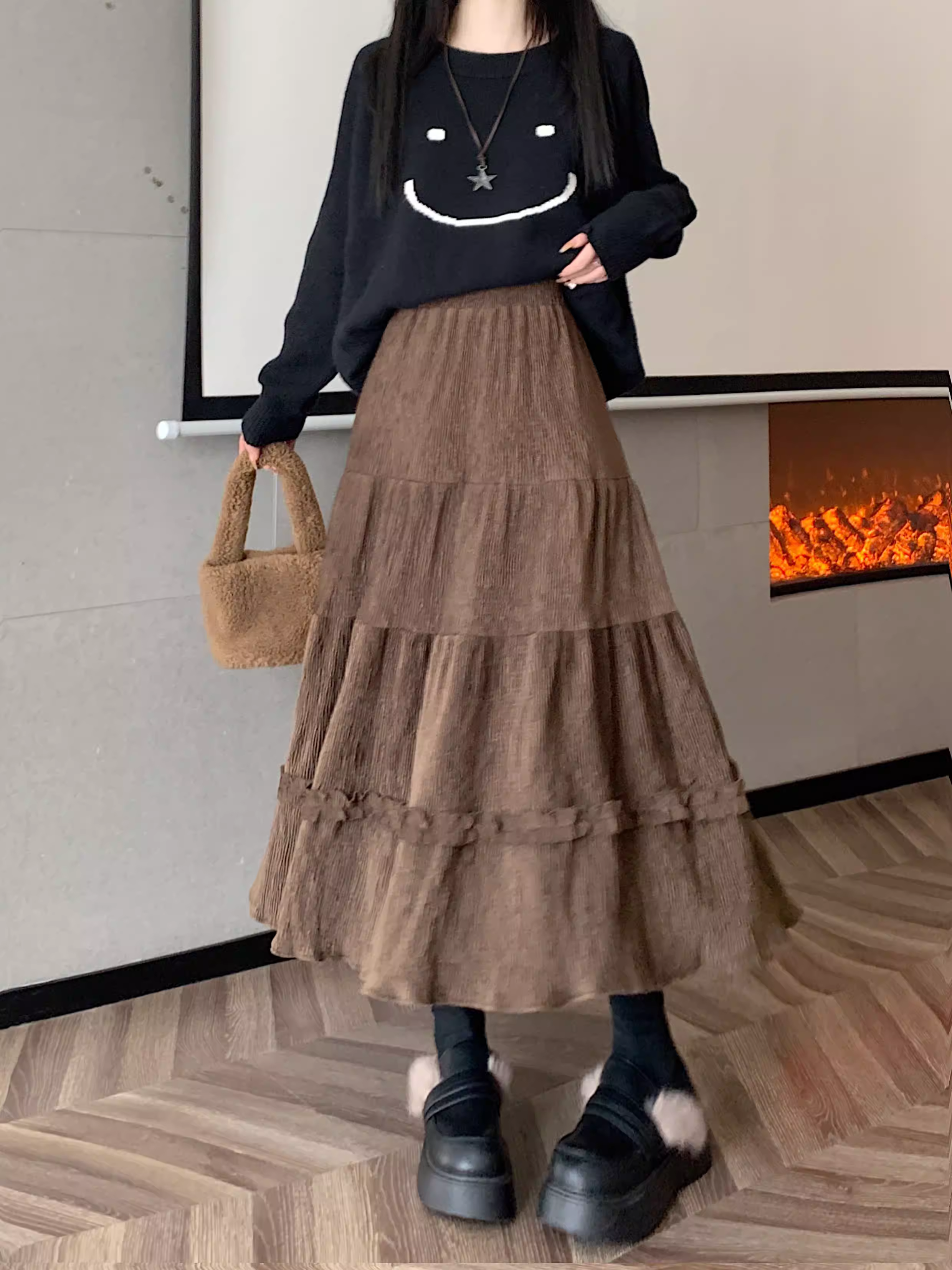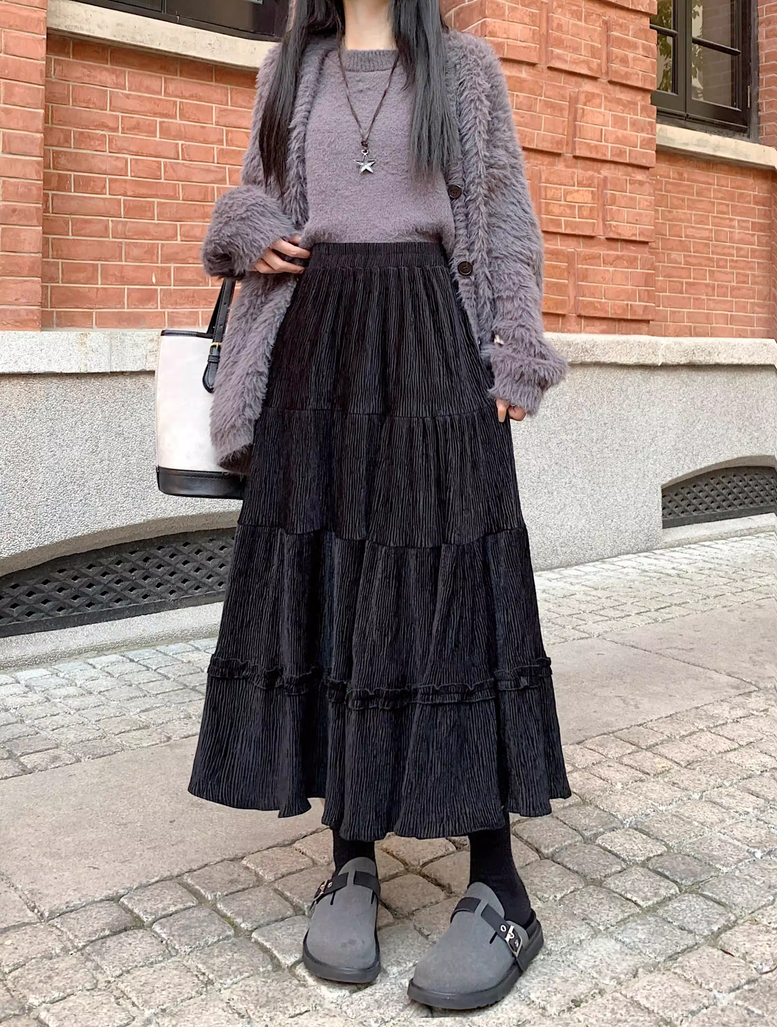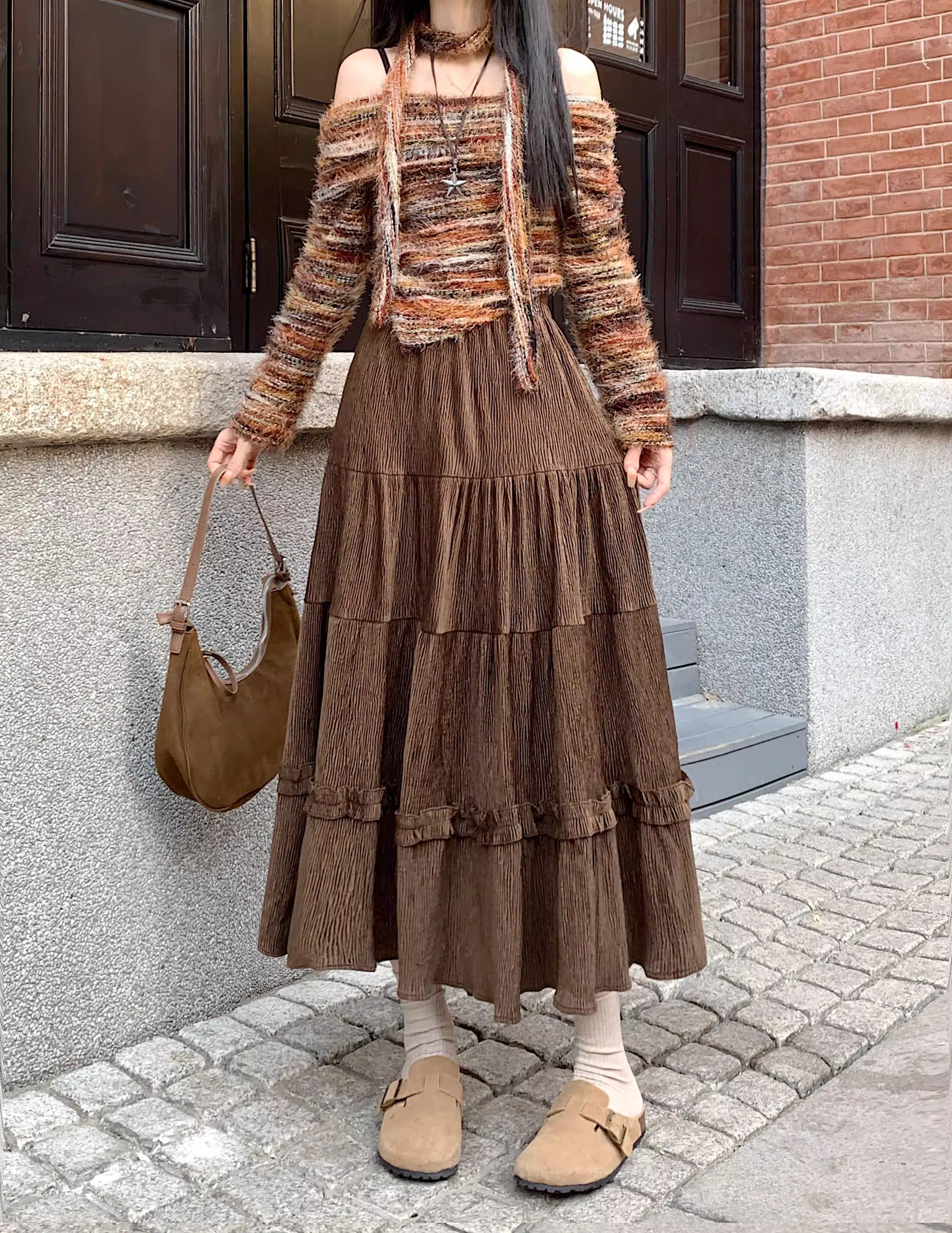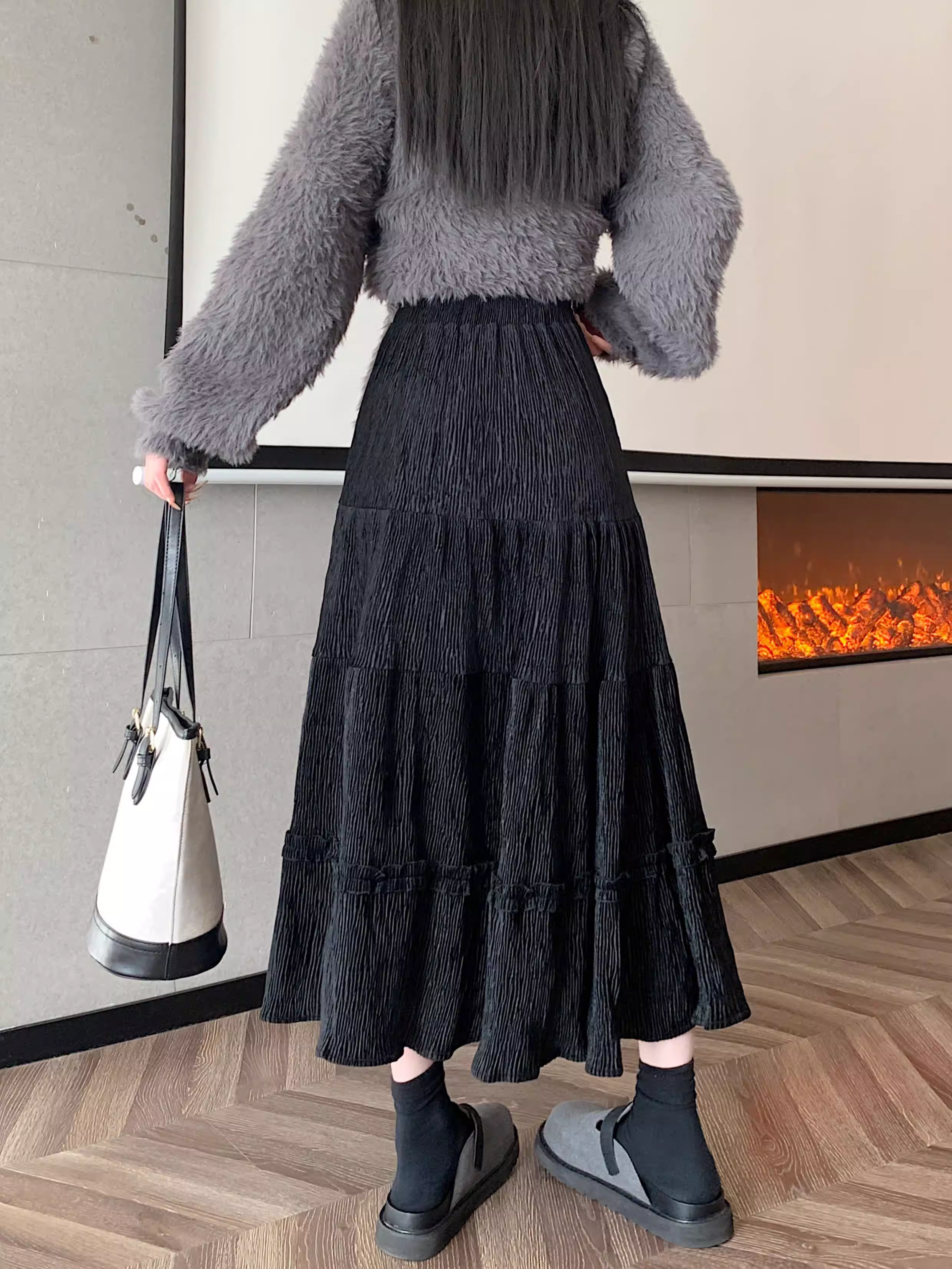 - Váy ren nhung La Chapelle dành cho nữ, mẫu mới thu đông 2025, cạp cao, dáng ôm, dài ngang đùi, xếp tầng