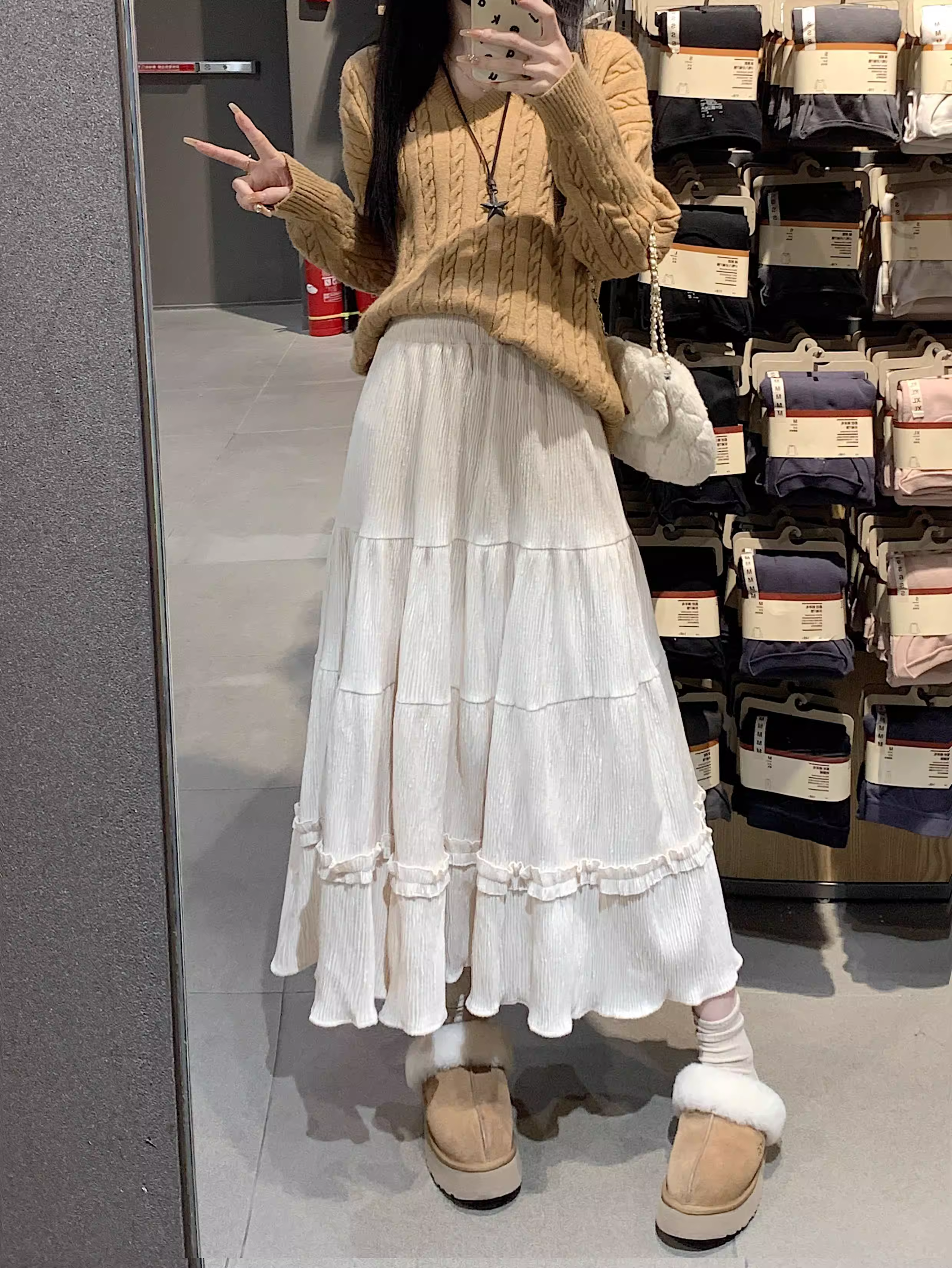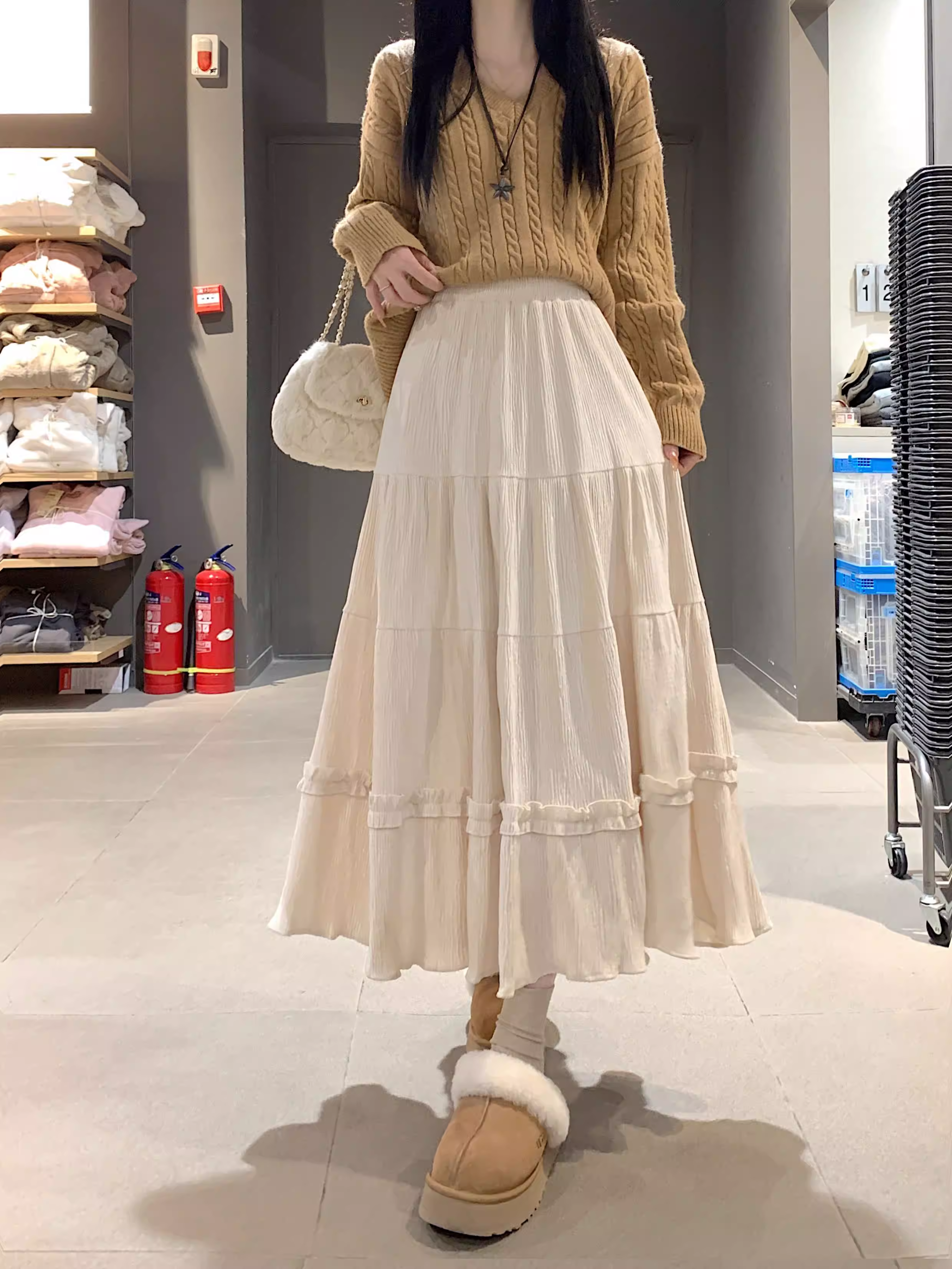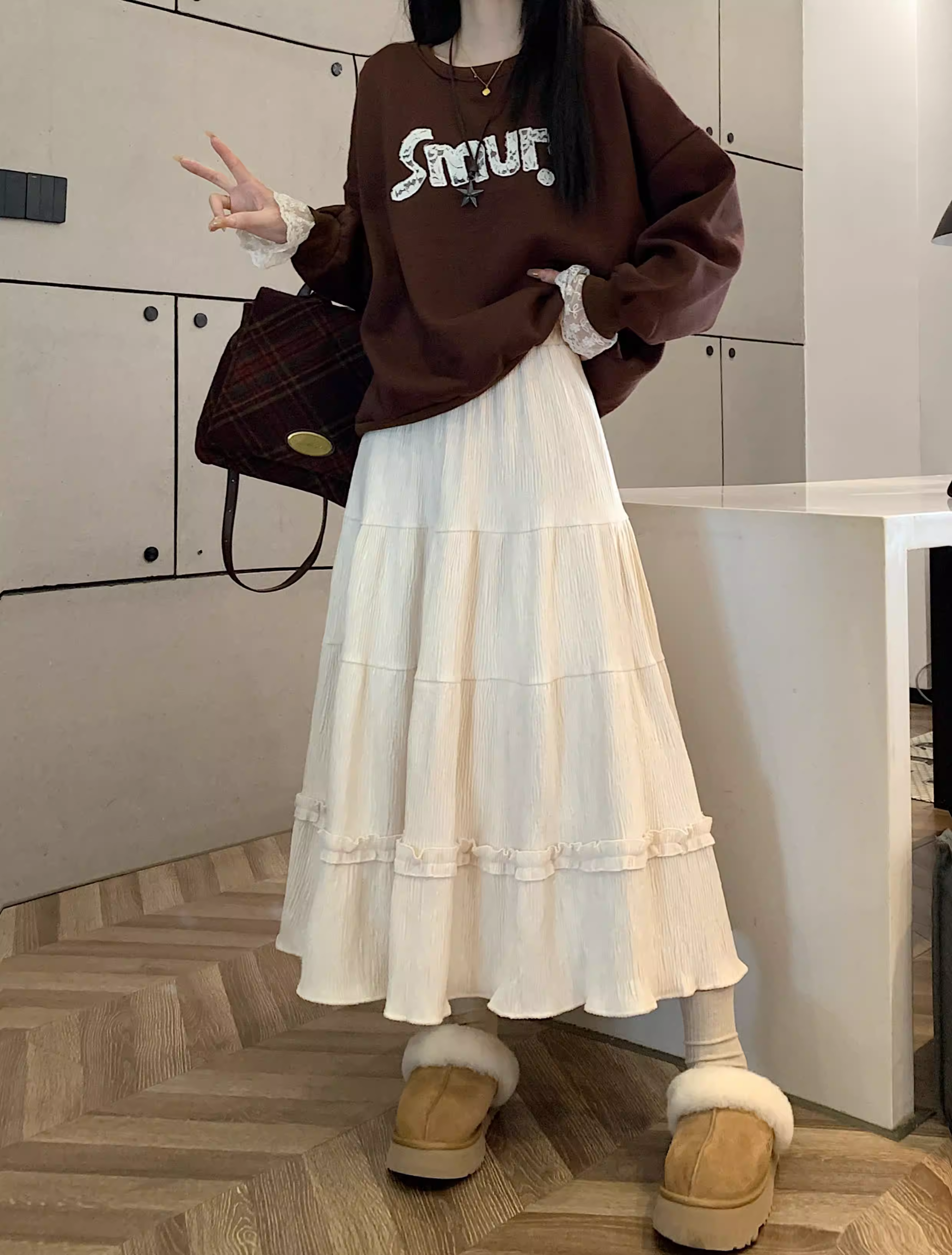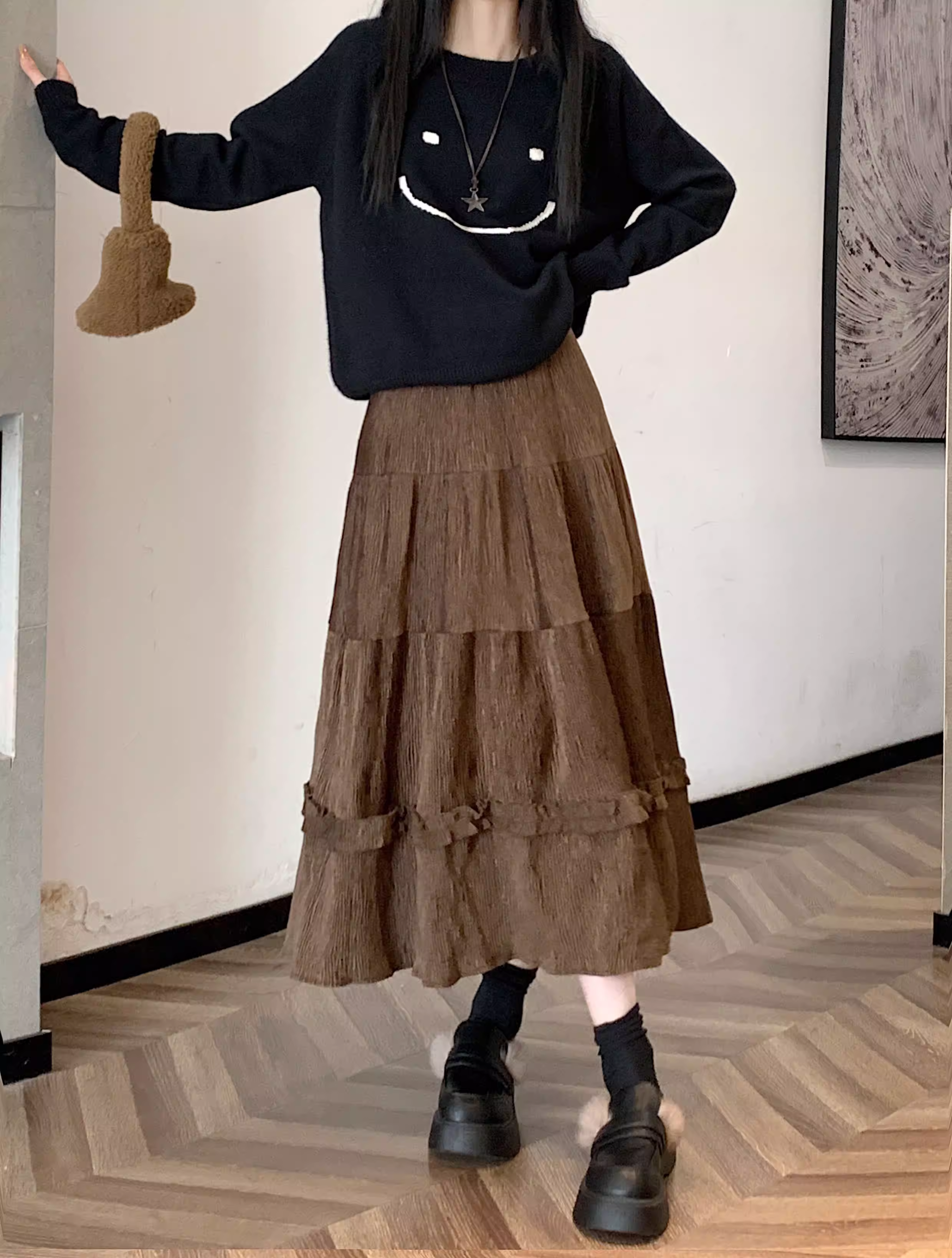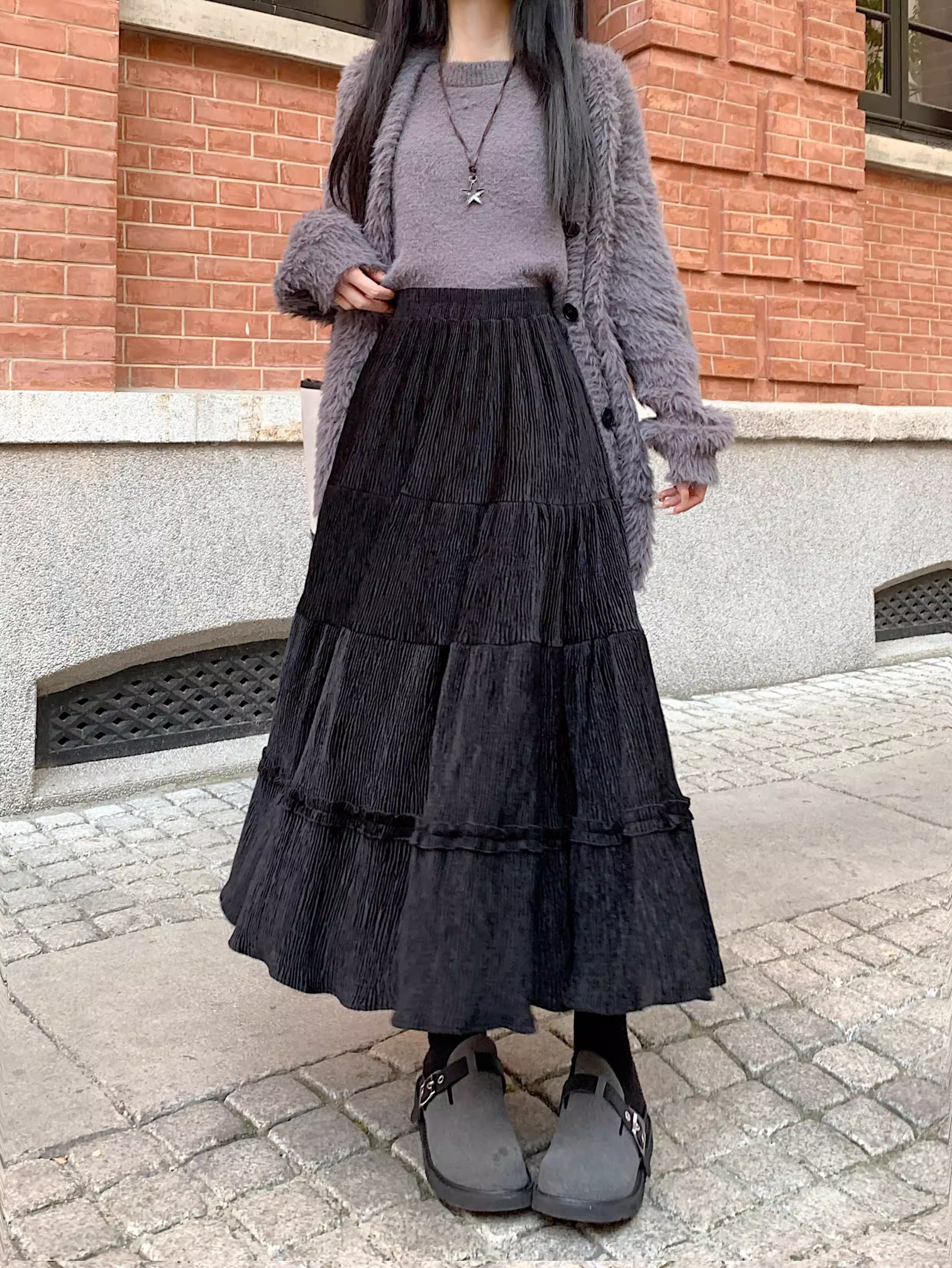 - Váy ren nhung La Chapelle dành cho nữ, mẫu mới thu đông 2025, cạp cao, dáng ôm, dài ngang đùi, xếp tầng