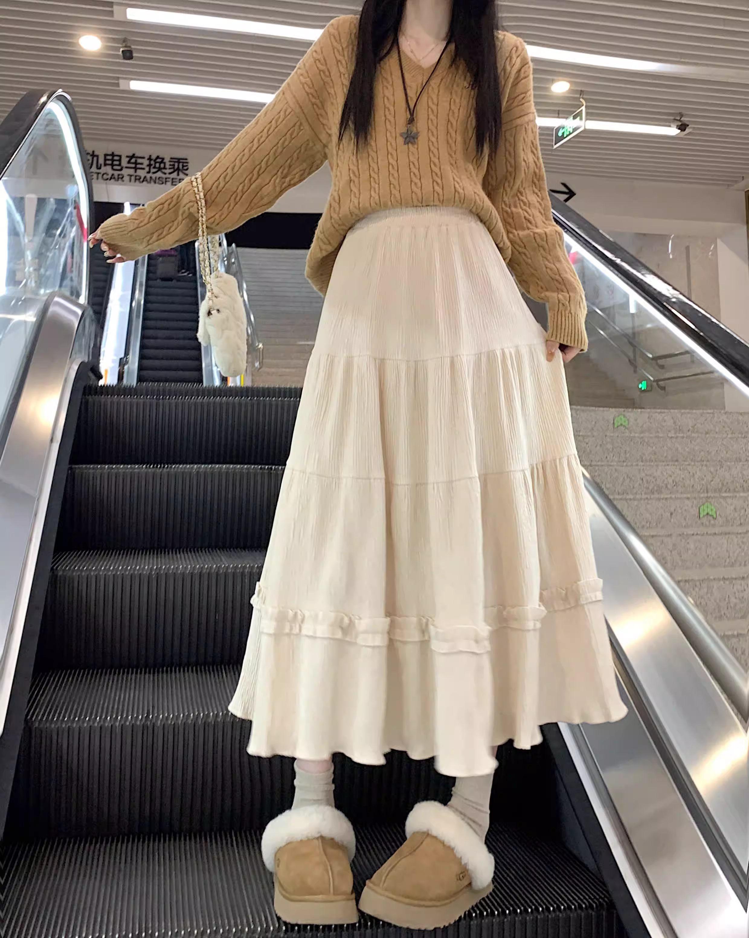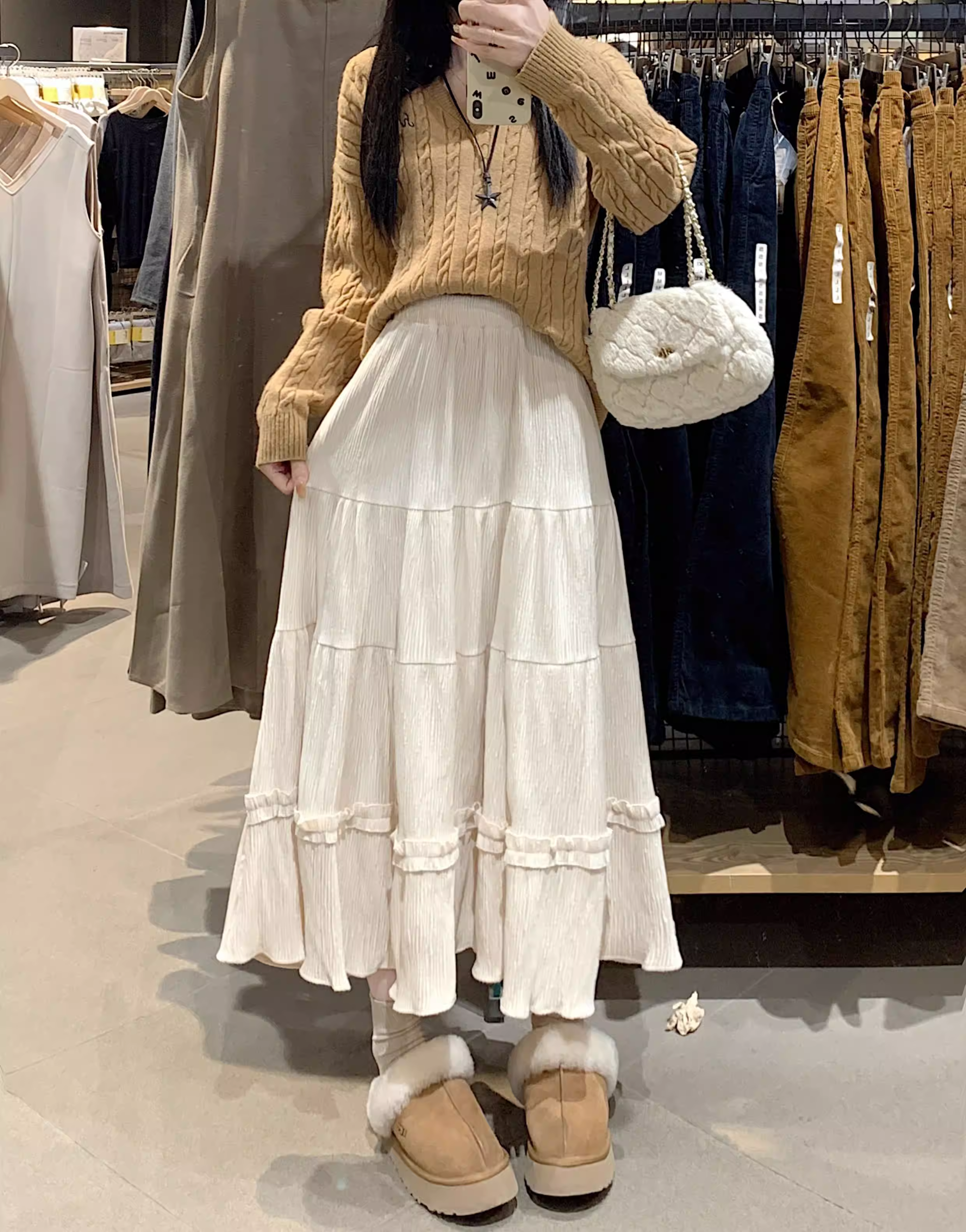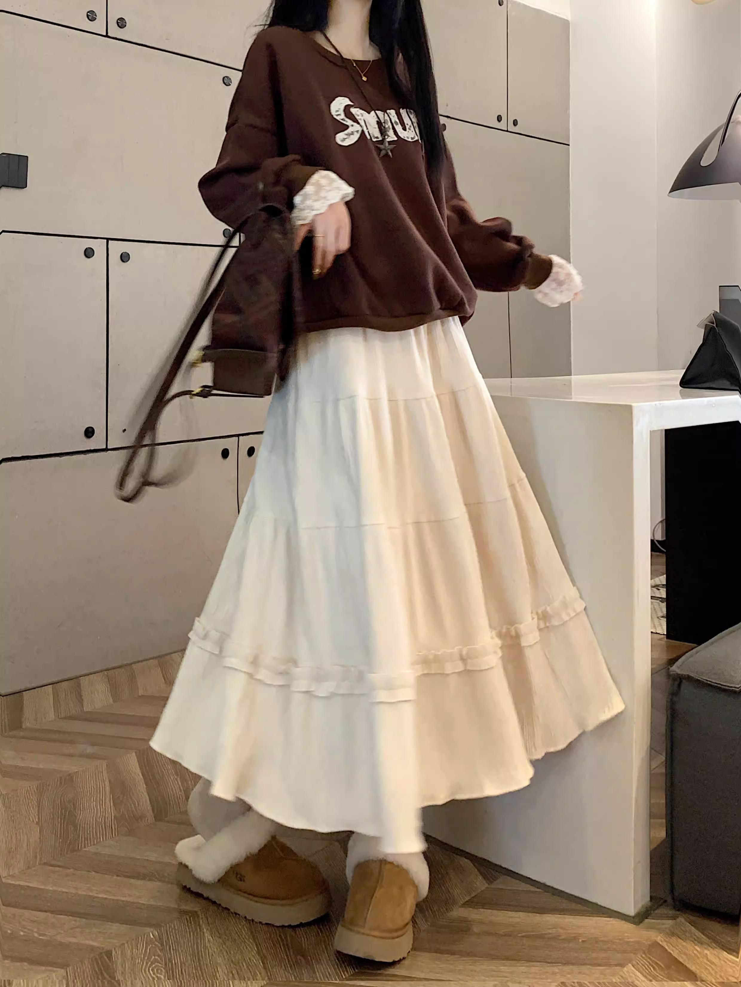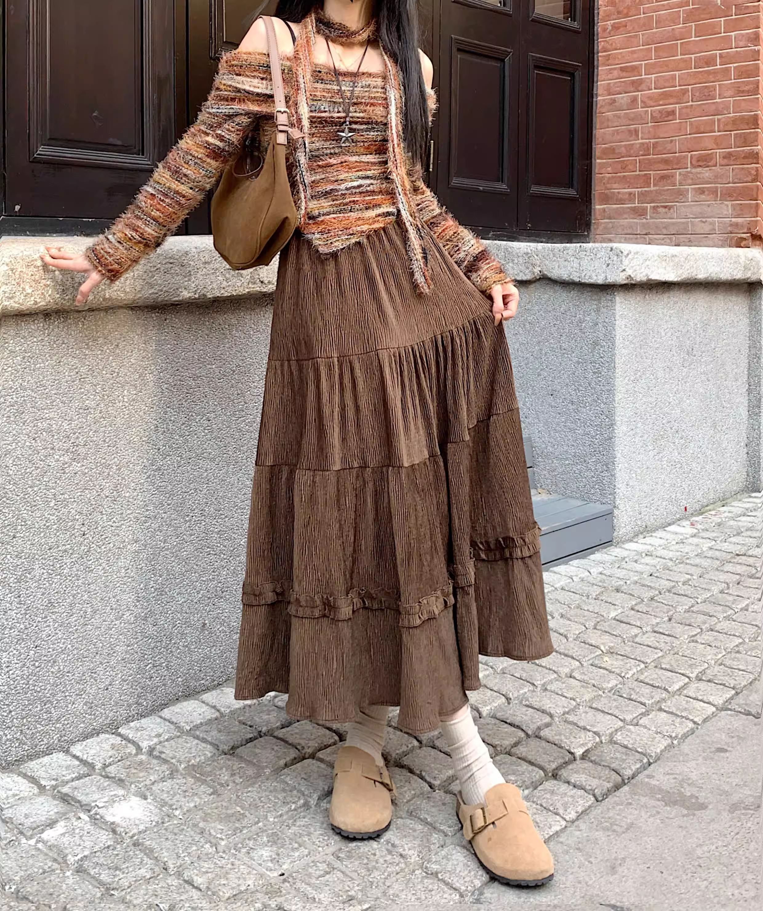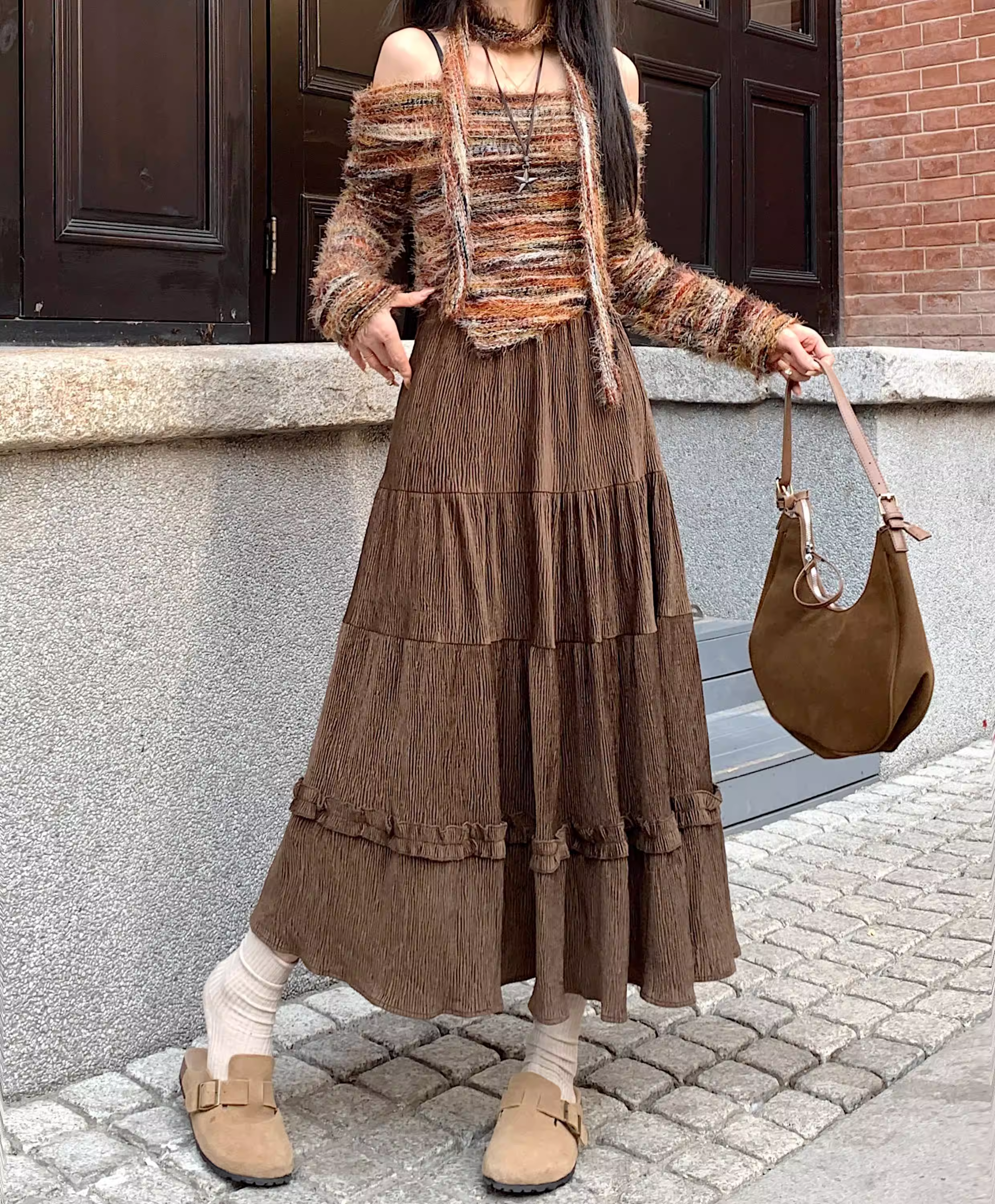 - Váy ren nhung La Chapelle dành cho nữ, mẫu mới thu đông 2025, cạp cao, dáng ôm, dài ngang đùi, xếp tầng