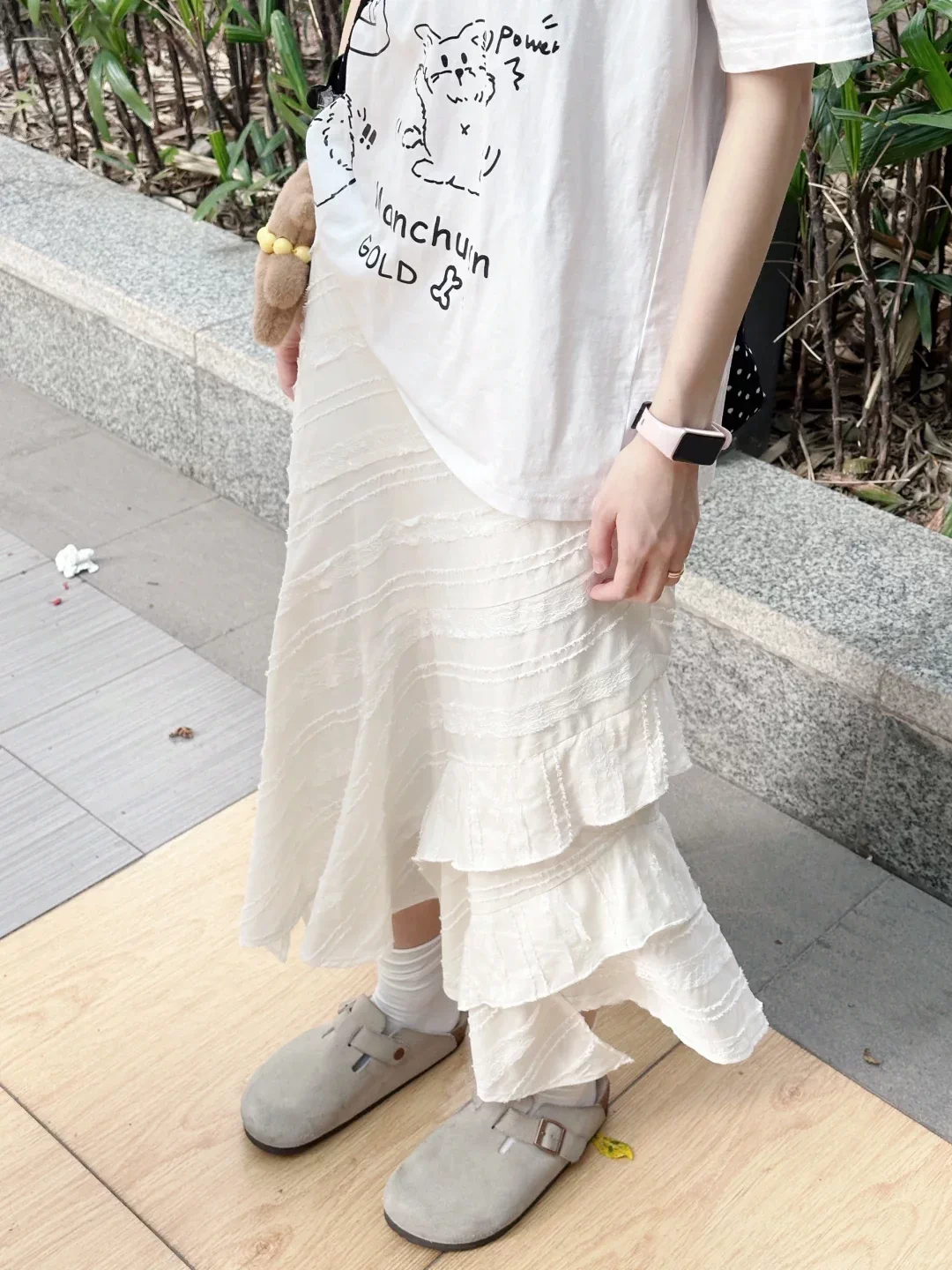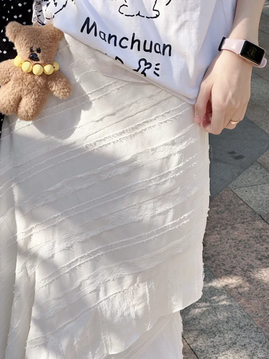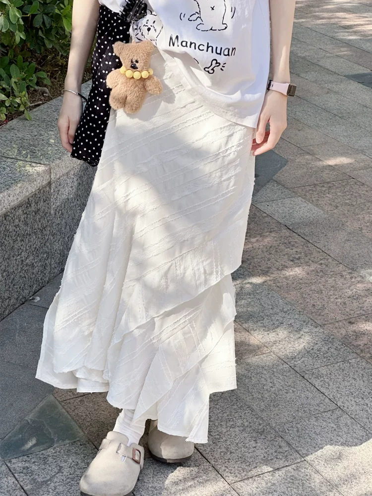 Váy trắng không đều kiểu dáng dành cho nữ, mùa xuân hè, cỡ lớn, lưng cao, che hông, thon gọn, váy đuôi cá chữ A dài vừa phải