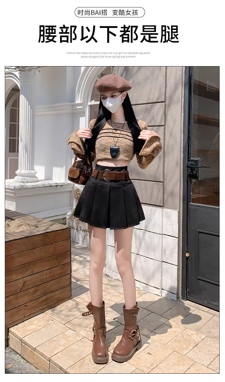- Váy xếp ly da lộn màu nâu dành cho nữ, mùa thu đông, váy mini da lưng cao rất xinh.