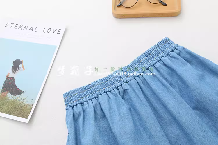 - Váy xếp ly phối màu phong cách Mori Girl mùa hè 2024 Dream Box, chất liệu denim, lưng thun, dáng chữ A, dành cho nữ
