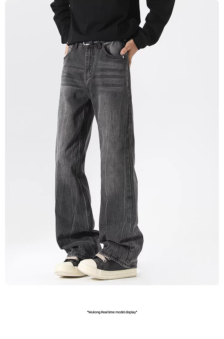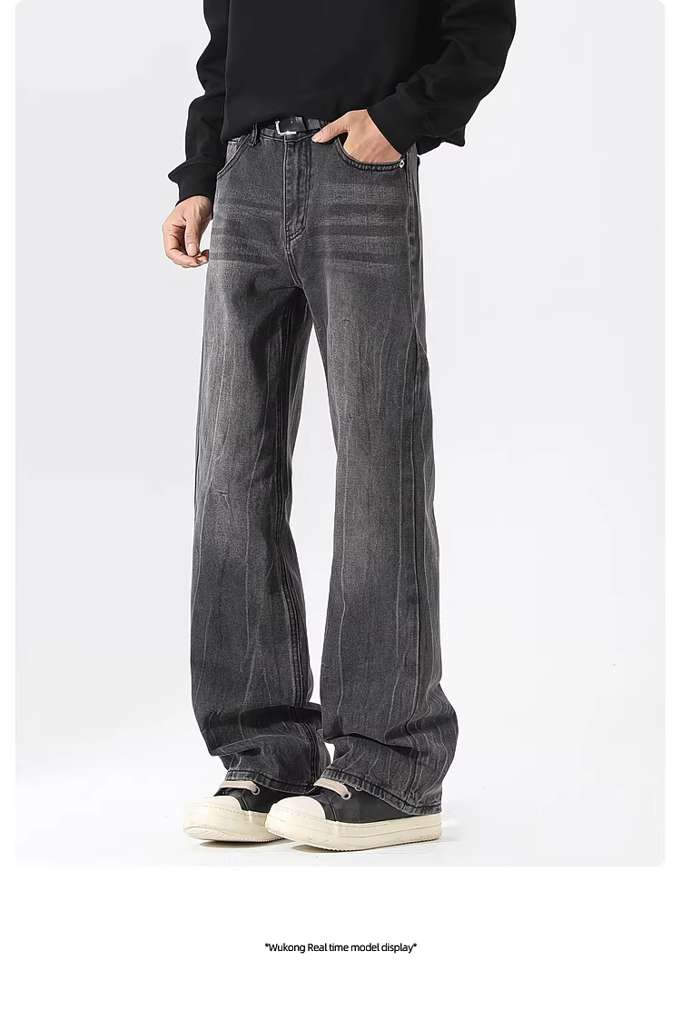 Wukong có sẵn quần jean denim nam kiểu Mỹ, chất liệu washed crackle, dáng cleanfit, phong cách retro, ống loe dài.